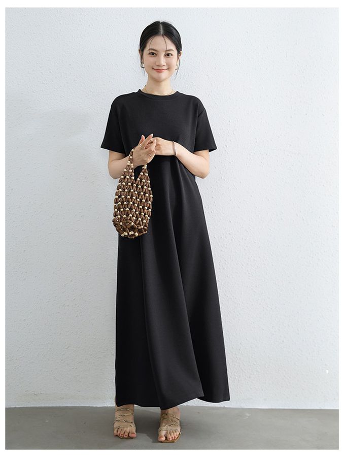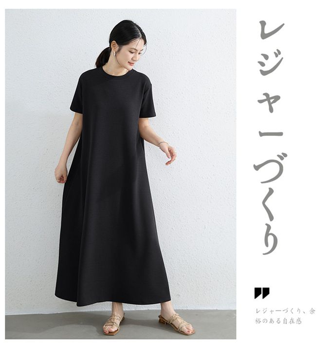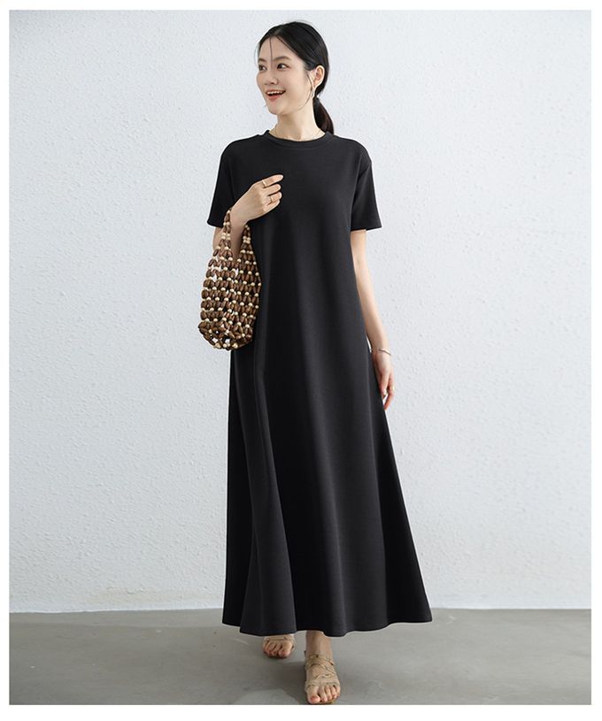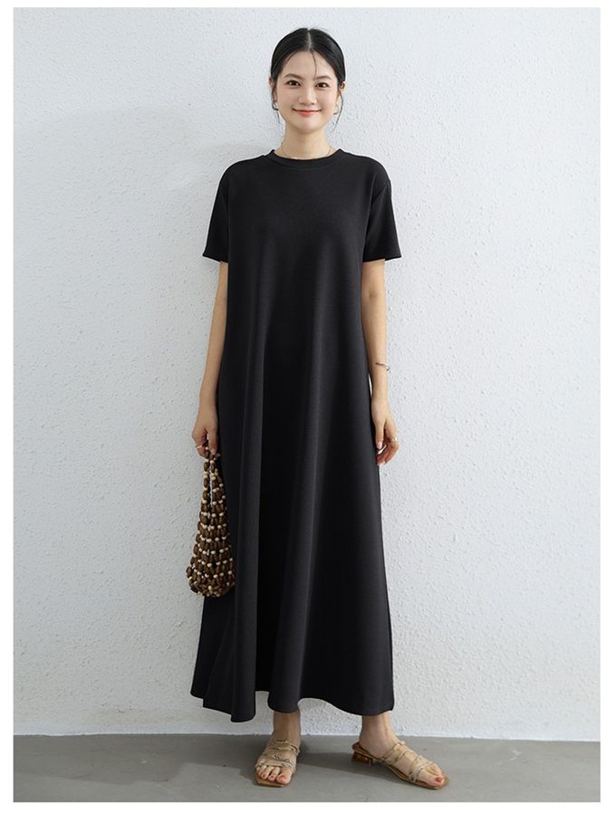 氣質華夫格顯瘦A字短袖長洋裝-黑色