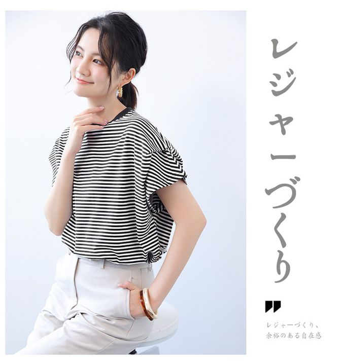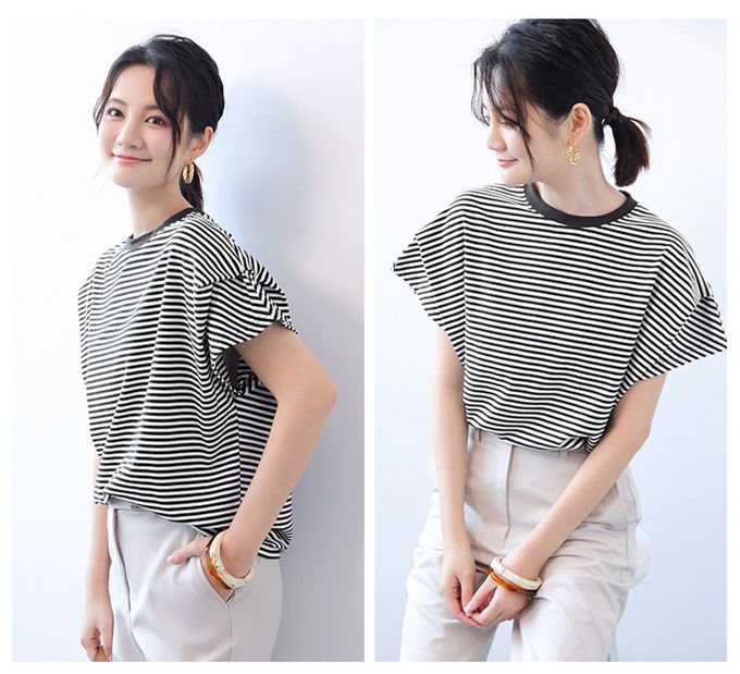 Yukié - 包色推薦!超顯瘦壓褶法式袖上衣-黑色條紋 (F)