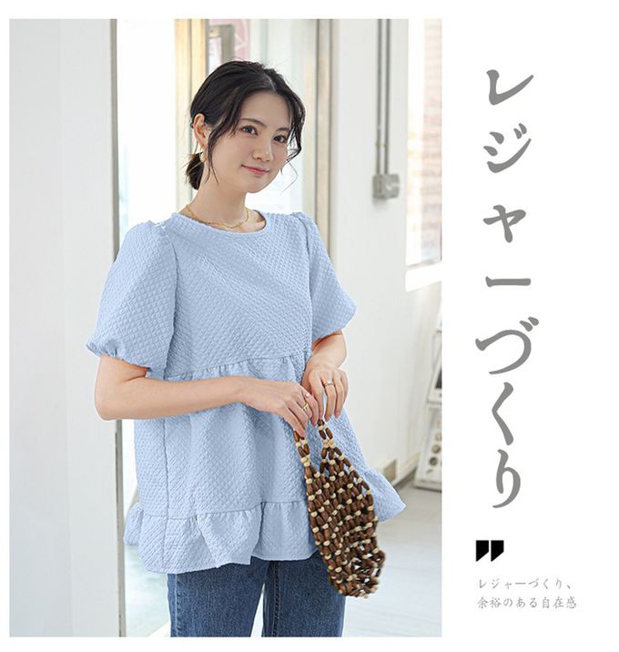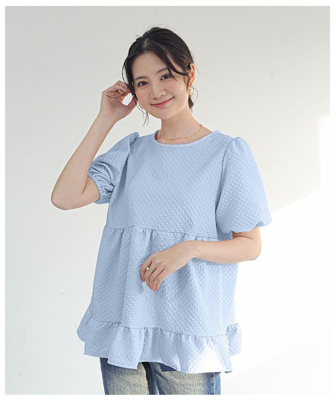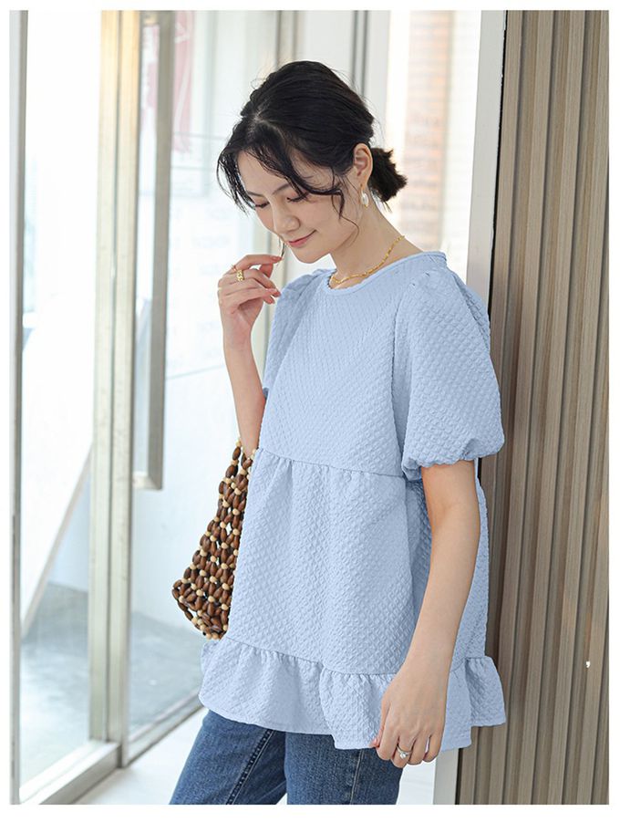 甜美減齡荷葉邊泡泡袖上衣-藍色