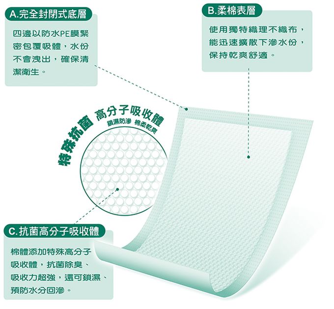 成分:不織布、吸水紙、紙漿、高分子聚合體、PE防水膠片