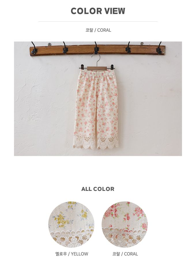 韓國 PuellaFLO - 鬆緊腰清爽花卉鏤空花布拼接褲-粉花