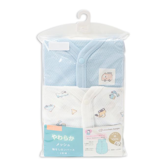 akachan honpo - 無袖網眼包屁衣2件組前開式-交通工具-淺藍色