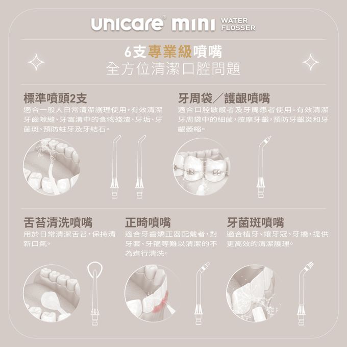 • 6支噴嘴,全方位清潔口腔問題
