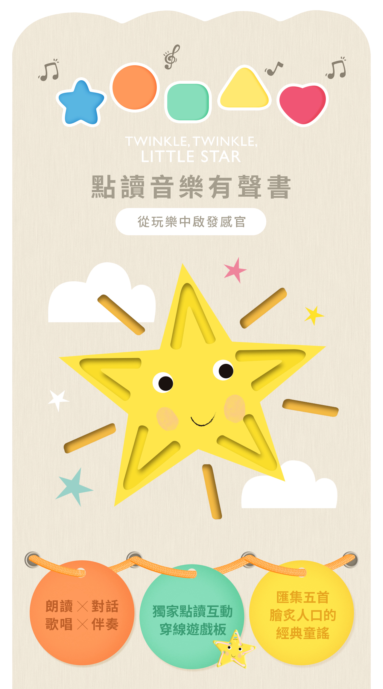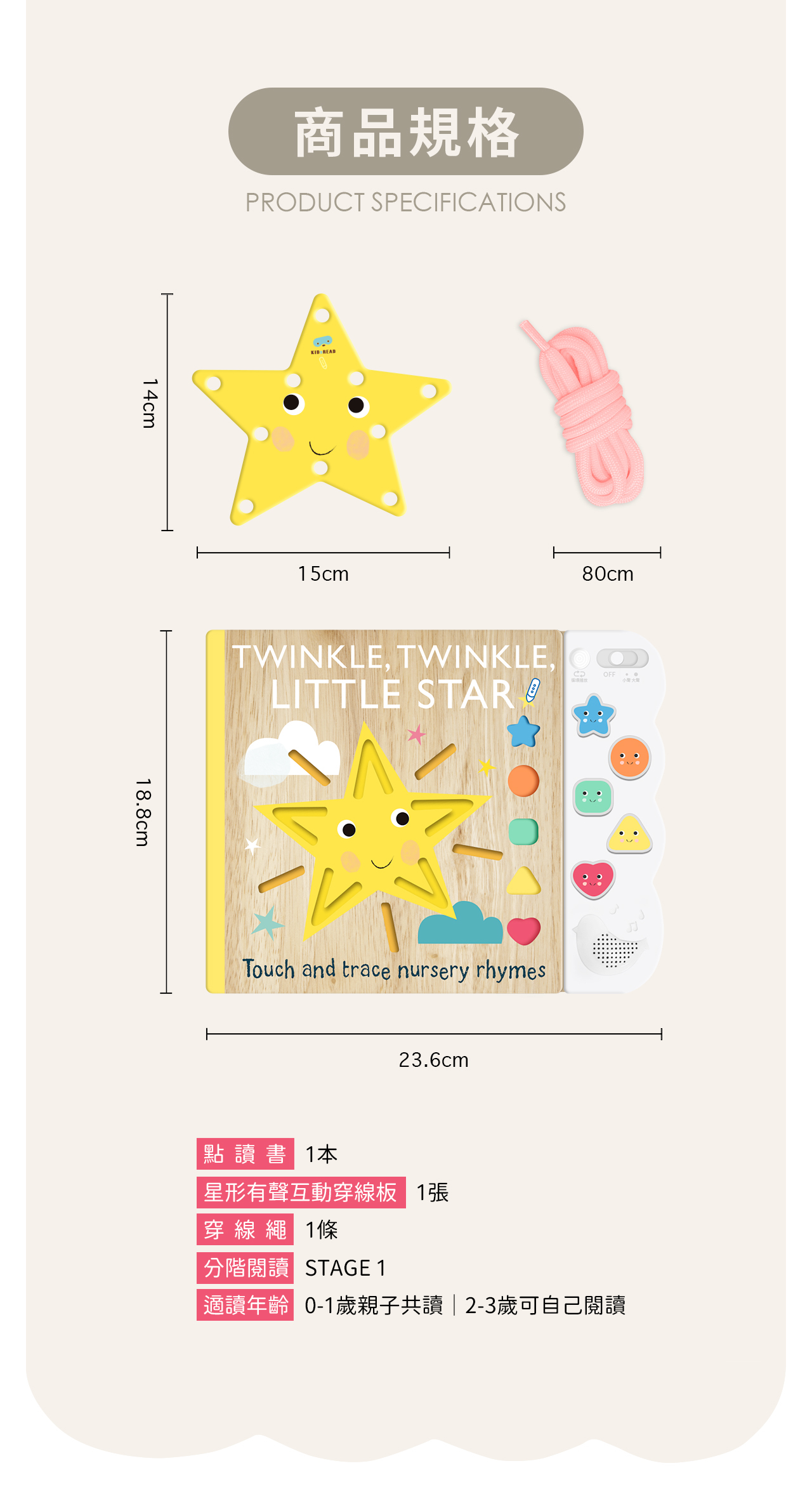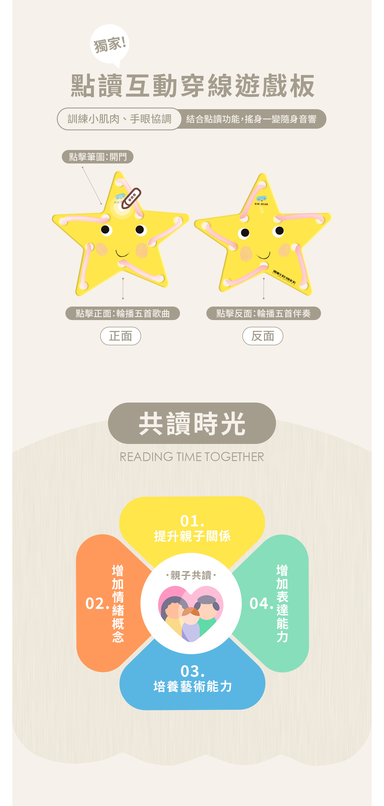 內容物:1本點讀書(電池可拆)+1張星形有聲互動穿線板+1條穿線繩