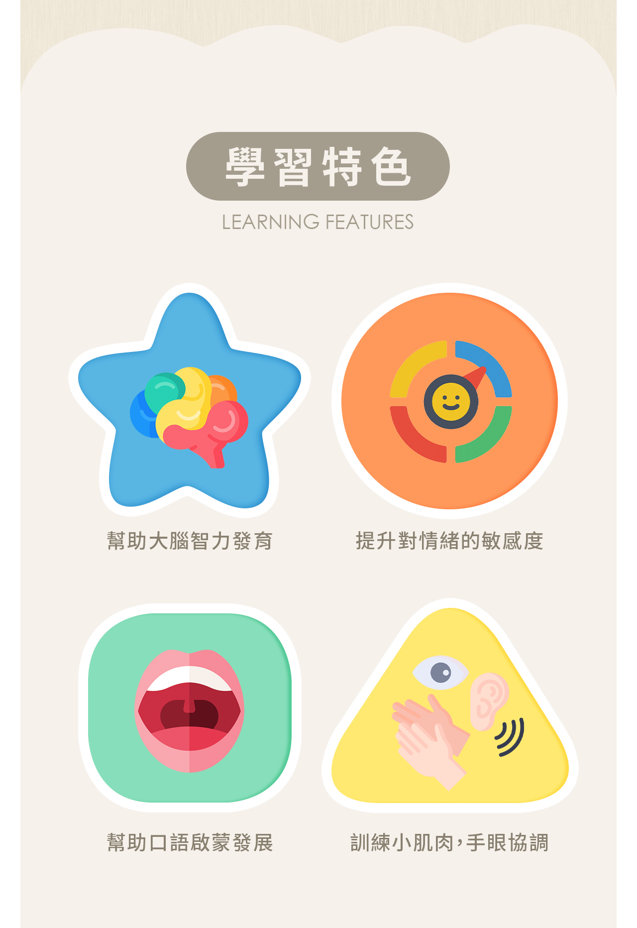 好聽的旋律讓弟弟會隨著音樂搖擺,跟著由真人錄音的聲音中,學著開口說和唱歌,媽咪也可以向孩子介紹歌詞意義,同樣也能達到親子互動的樂趣~