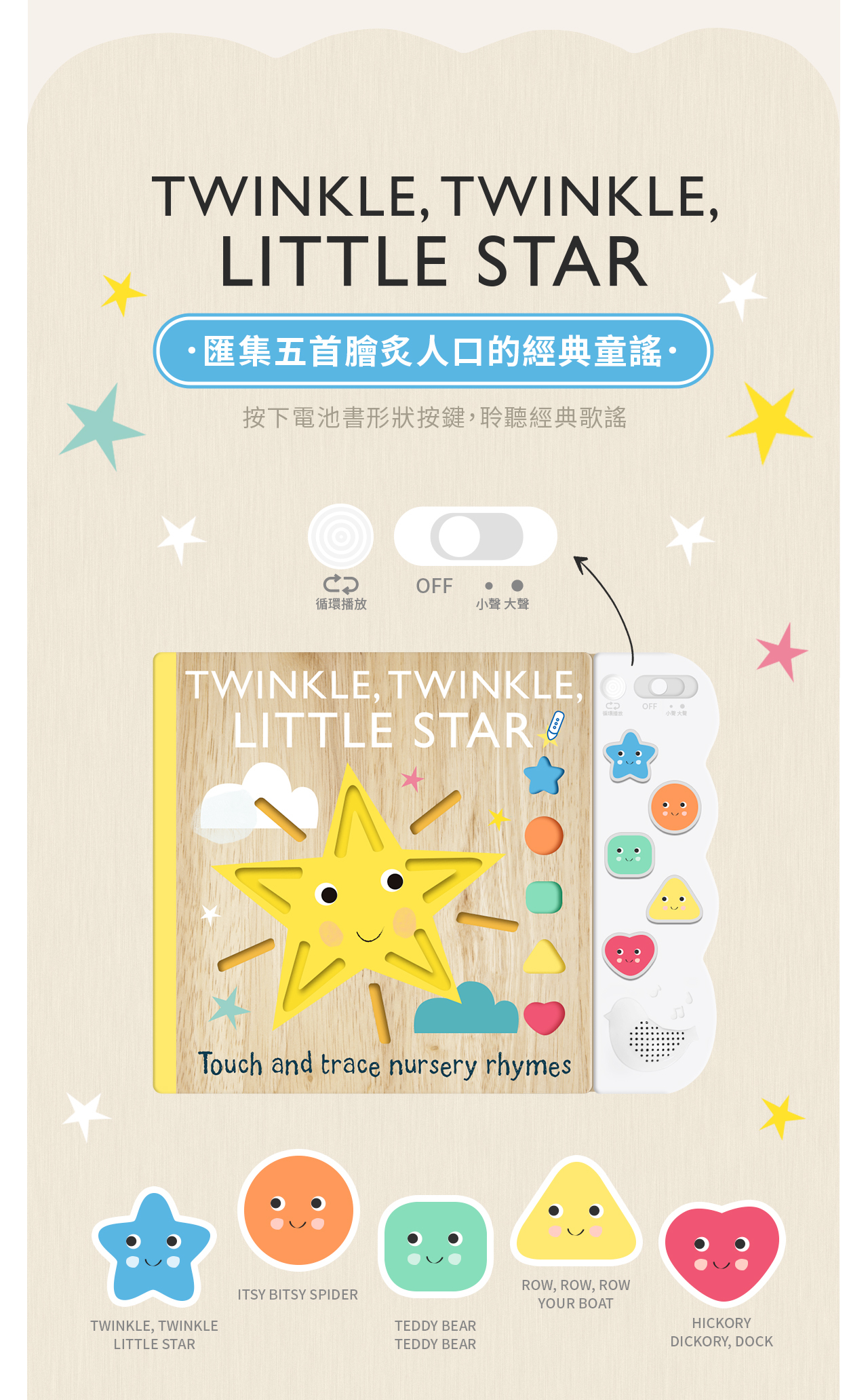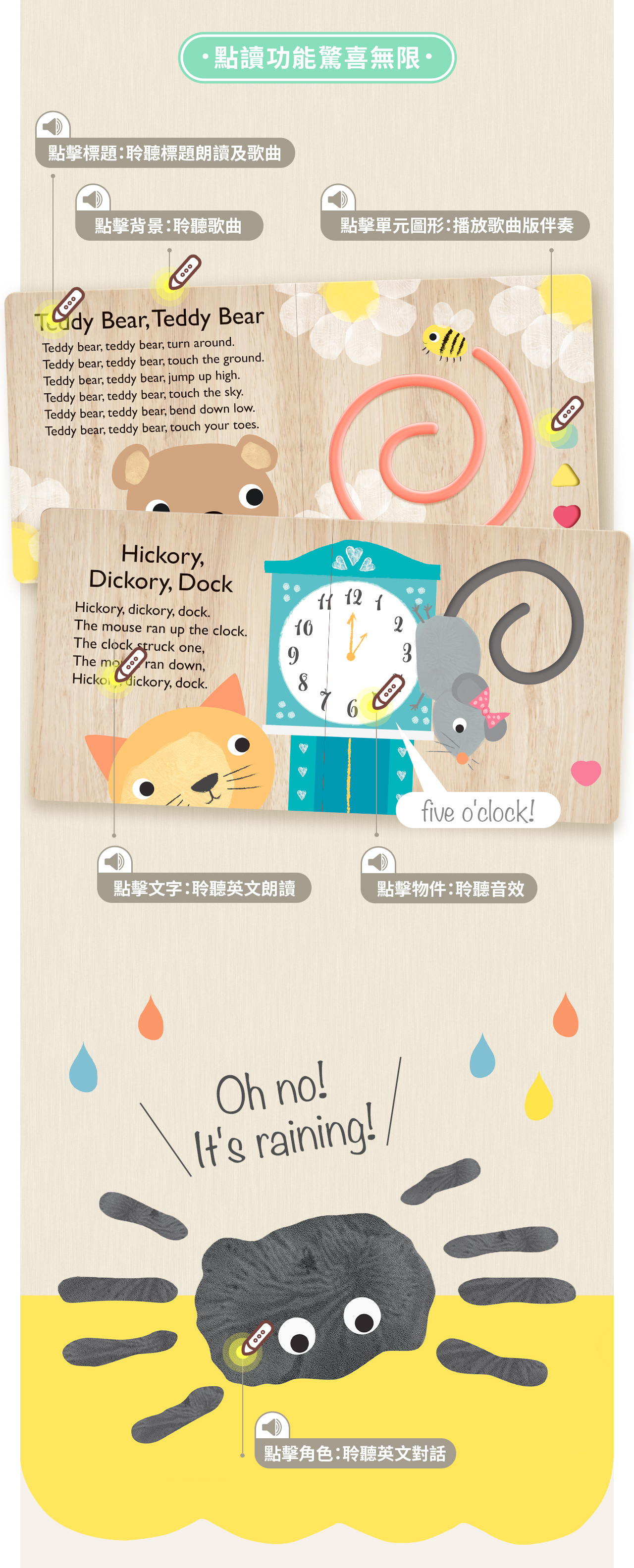 溫潤木質風格的書本是不是顯得更有質感啦~看看右側的五個按鈕,分別對應這五首兒歌:〈Twinkle, Twinkle, Little Star〉、〈Itsy Bitsy Spider〉、〈Teddy Bear, Teddy Bear〉、〈Row, Row, Row Your Boat〉、〈Hickory, Dickory, Dock〉