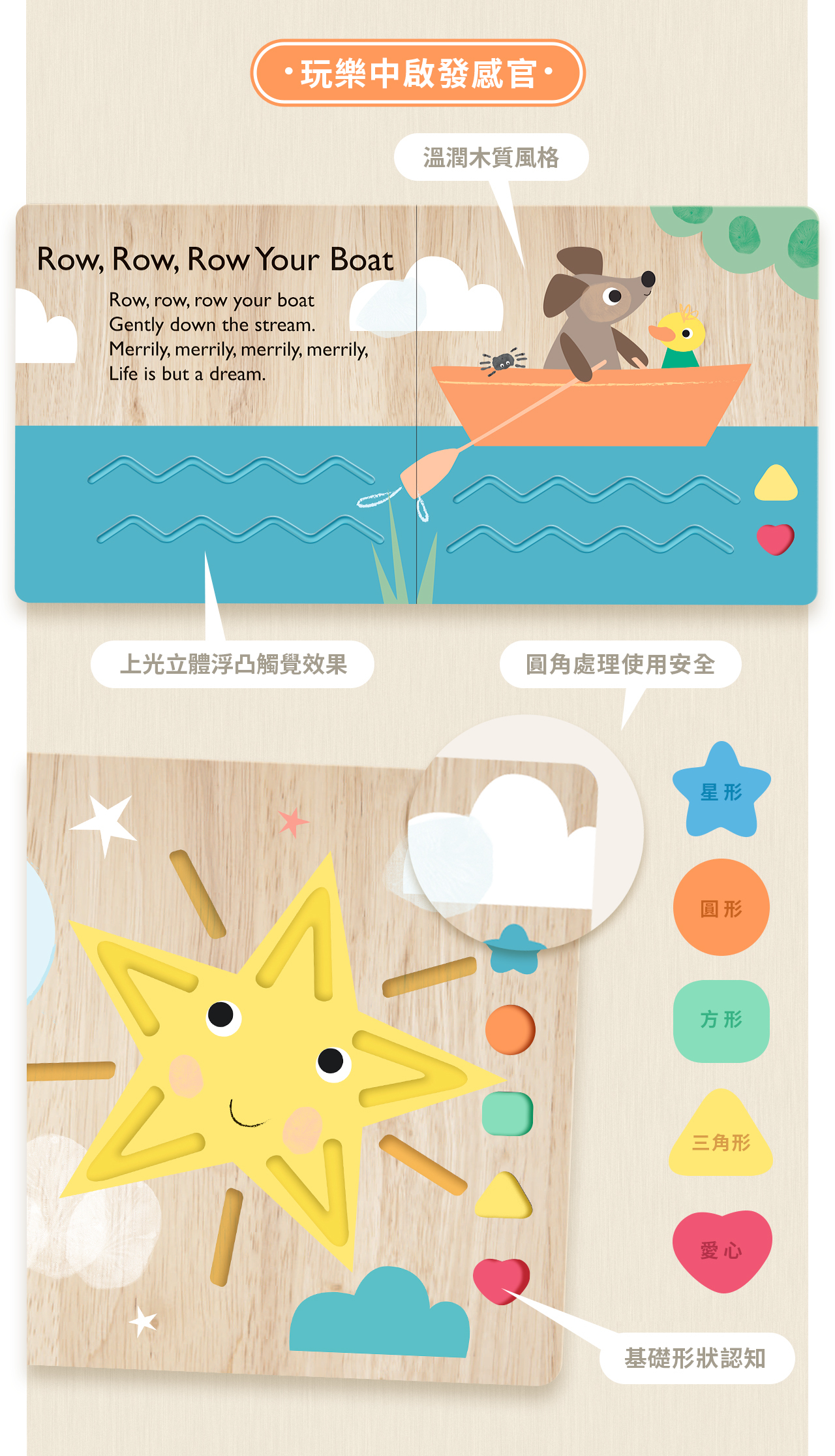 透過一本音樂書從玩樂中啟發感官,幫助孩子大腦智力發育、提升對情緒的敏感度、口語啟蒙發展、訓練肌肉和手眼協調。