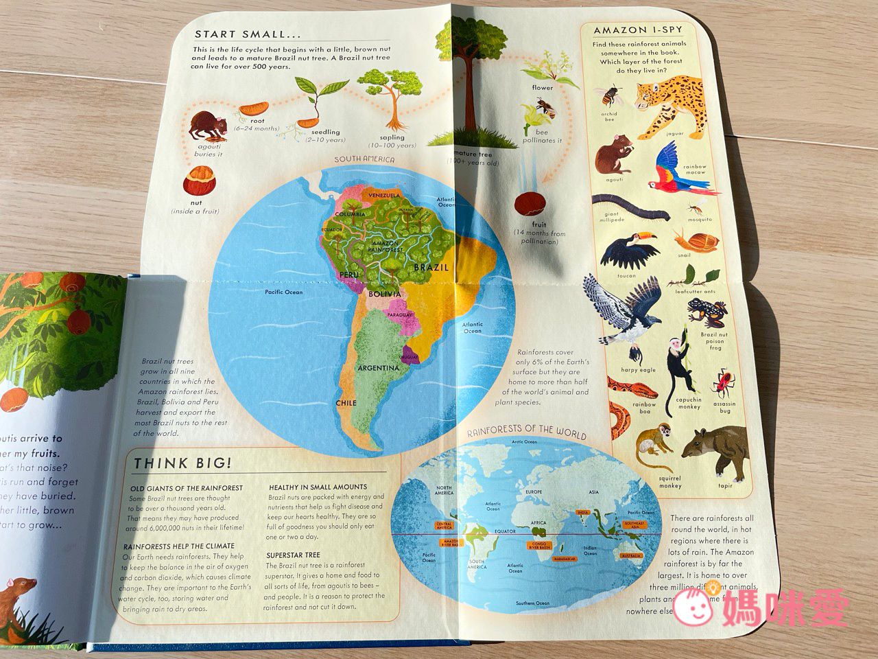 在書的最後還有一個折疊大地圖海報,展開來認識極地與雨林生物,整理前面所聽到學到的內容外,也有設計有趣的互動尋找遊戲!