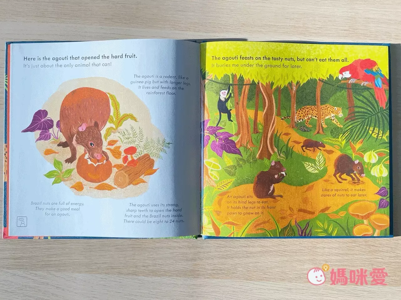 書裡可以認識我們平常看不到的雨林動植物和生態環境之外,也能從細緻的插畫線條裡看到種子在落地發芽的過程(平常才不會看到種子落地深根的剖面咧)