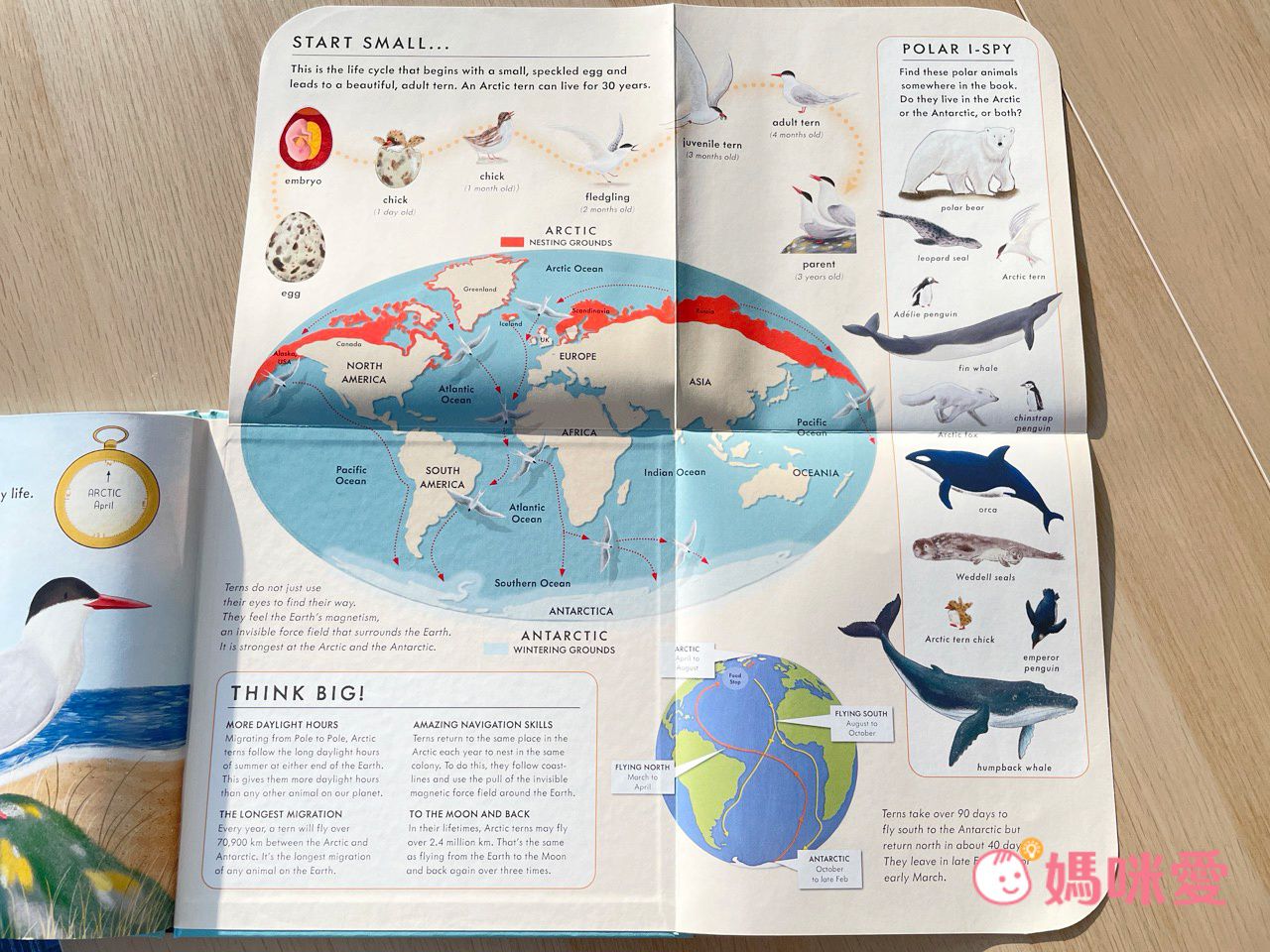 書末配有巨大摺頁,包括世界地圖🌍、生命週期圖和有趣的點讀互動 I-Spy 遊戲🔍。