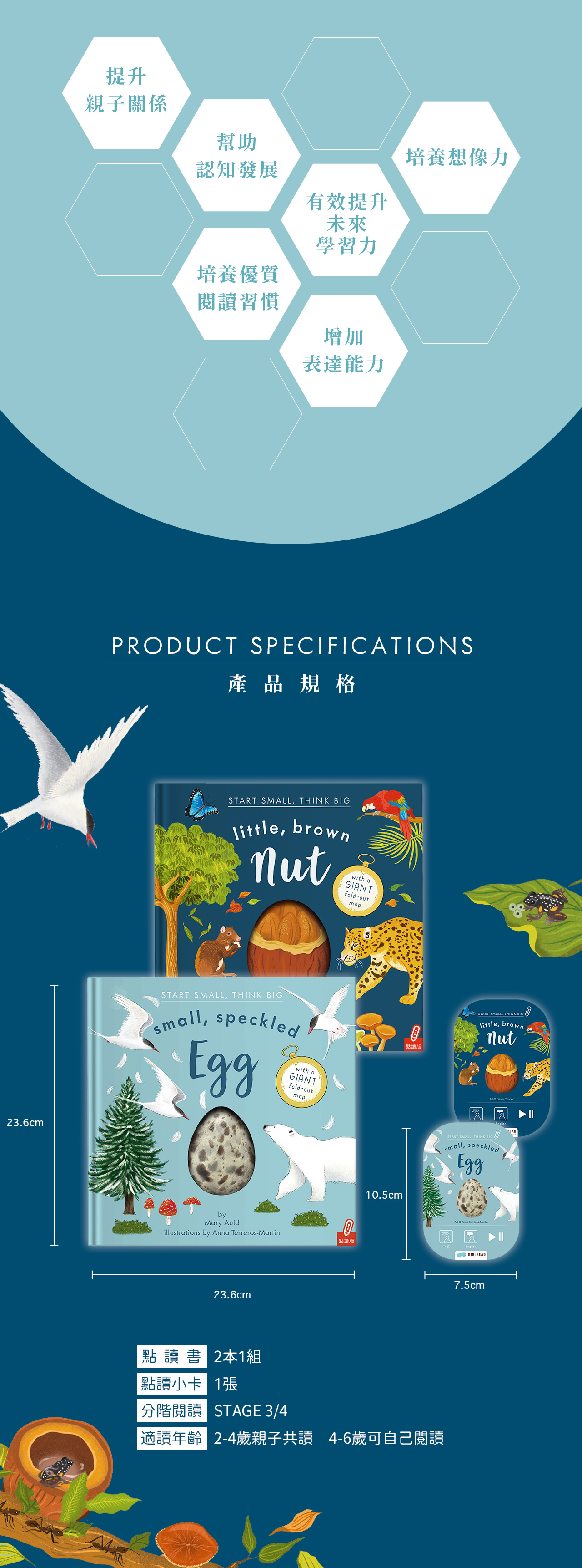 一套有兩種主題:《小小的斑點蛋》、《小小的棕色堅果》。這系列會帶領孩子觀察生命從小小開始,與自然世界的大大結合,再延伸到全球焦點。開拓孩子視野、滿足好奇心及求知欲!