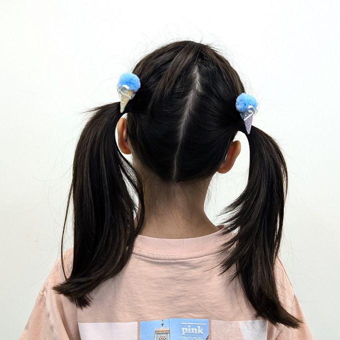這麼可愛的冰淇淋髮夾組,圓圓的藍色毛球,像是晴朗無雲清澈的天空;滿滿閃閃亮片的甜筒,一個是淺紫色,一個是淺橘色,在燈光下閃耀著繽紛色澤;還有可愛的小蝴蝶結點綴,別在髮上,別具清涼感!