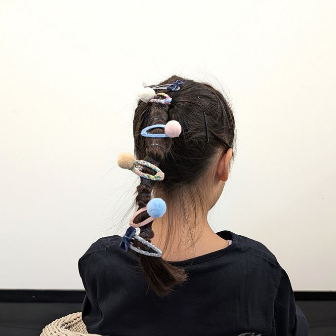 這款髮飾超好看!一共有四支髮夾,一對是包著小碎花的扁夾,另一對是包著粉色及粉藍色的扁夾,上頭都綴著可可愛愛的小毛球,好適合春夏佩戴!當成胸針,夾一排在胸前口袋也很吸睛!不想引人注目都難!