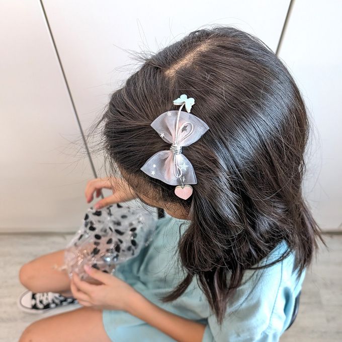 這款粉色髮夾組,粉色的蝴蝶輕紗綴著星星月亮亮片,細細的銀繩掛著粉色愛心與藍色蝴蝶,小女孩兒喜歡的夢幻元素通通都在這款髮夾上了!