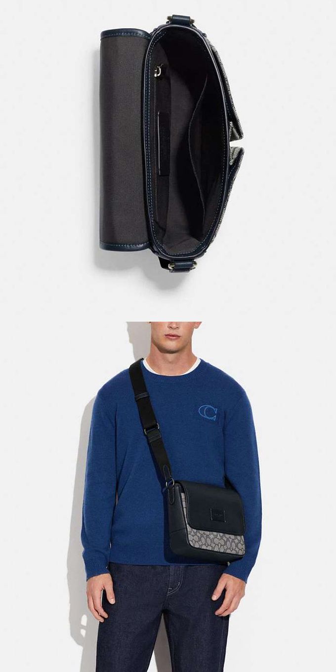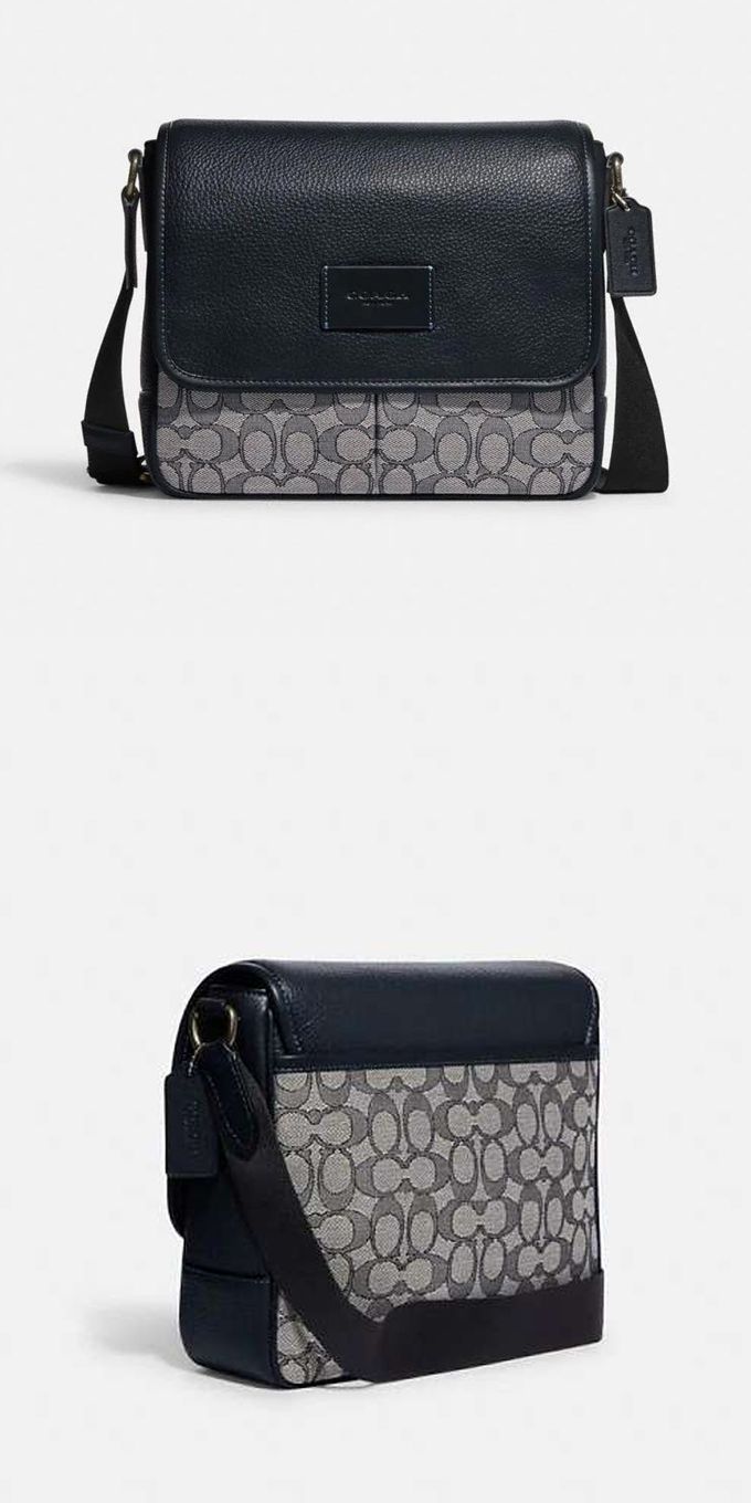 緹花布牛皮拼接郵差斜背包 (黑灰)