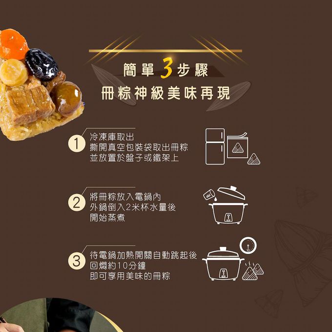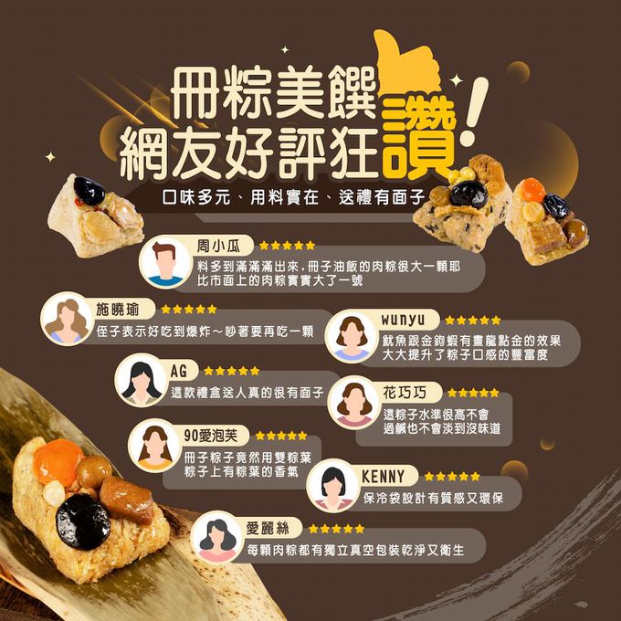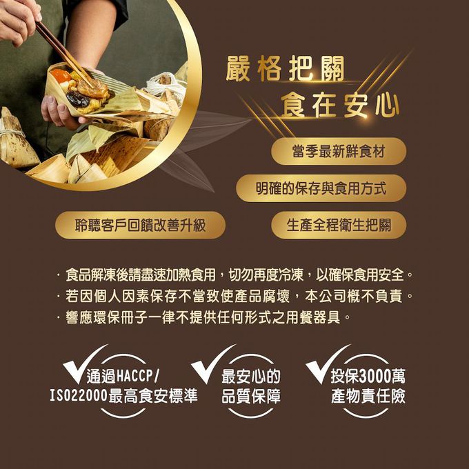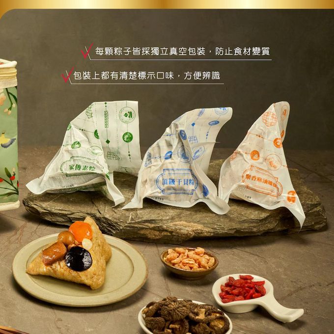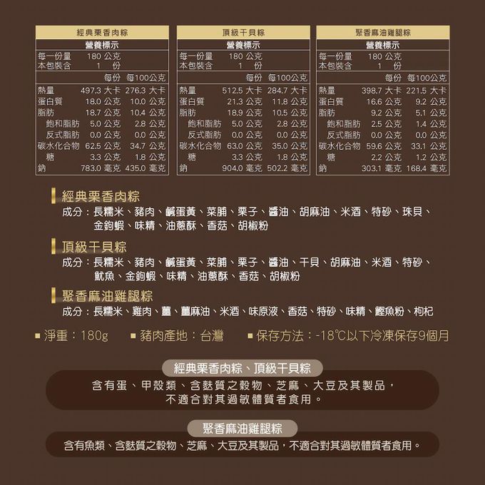 過敏原:經典栗香肉粽、頂級干貝粽:含有蛋、甲殼類、含麩質之穀物、芝麻、大豆及其製品,不適合對其過敏體質者食用。 聚香麻油雞腿粽:含有魚類、含麩質之穀物、芝麻、大豆及其製品,不適合對其過敏體質者食用。