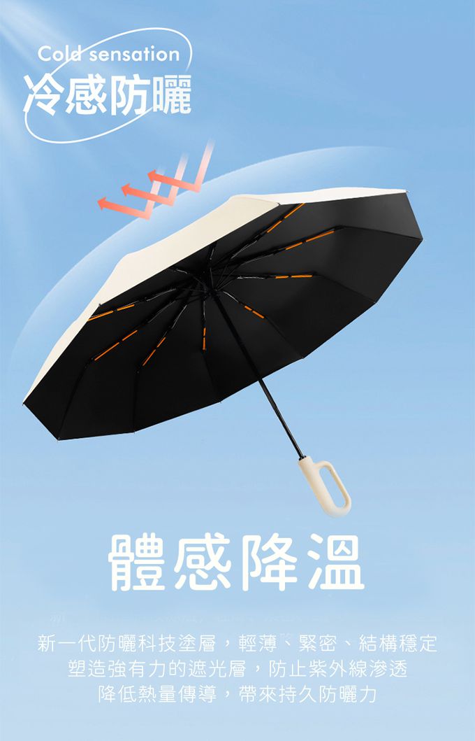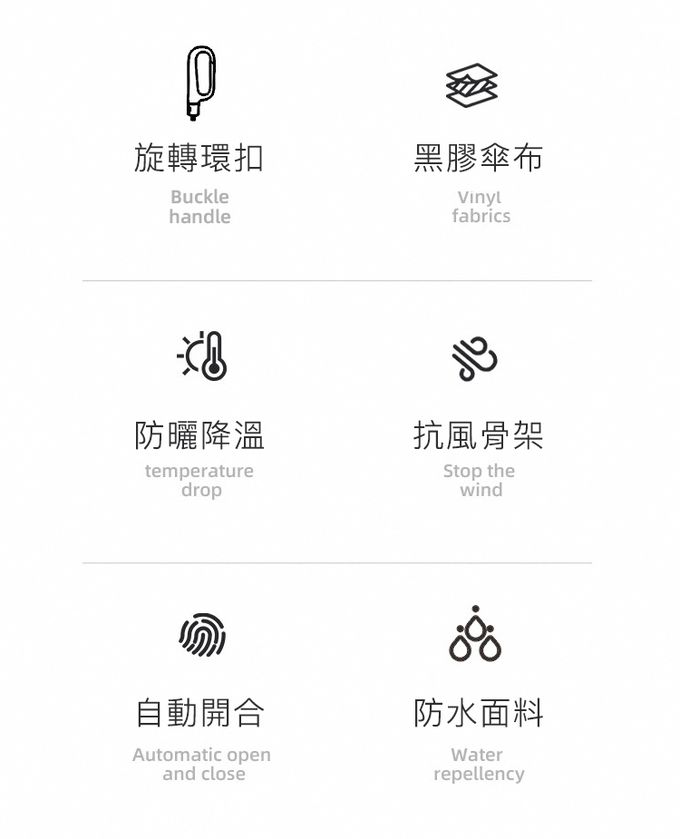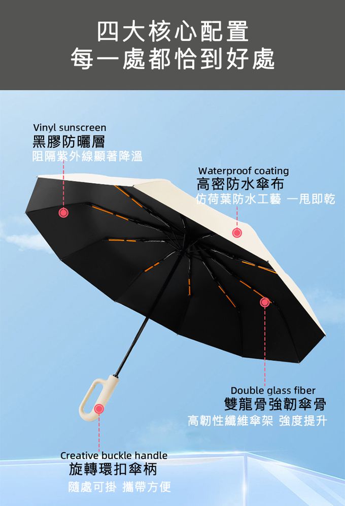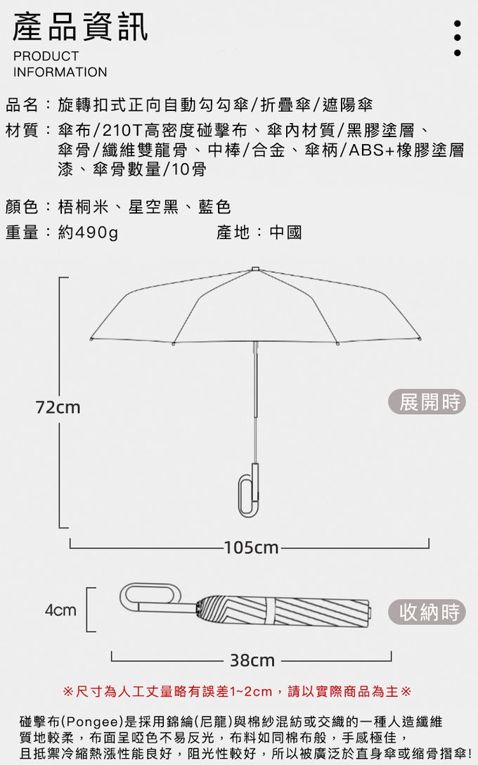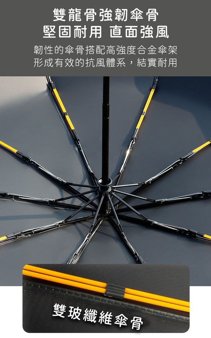 材質:傘布/210T高密度碰擊布、傘內材質/黑膠塗層、傘骨/纖維雙龍骨、中棒/合金、傘柄/ABS+橡膠塗層漆 傘骨數量:10骨