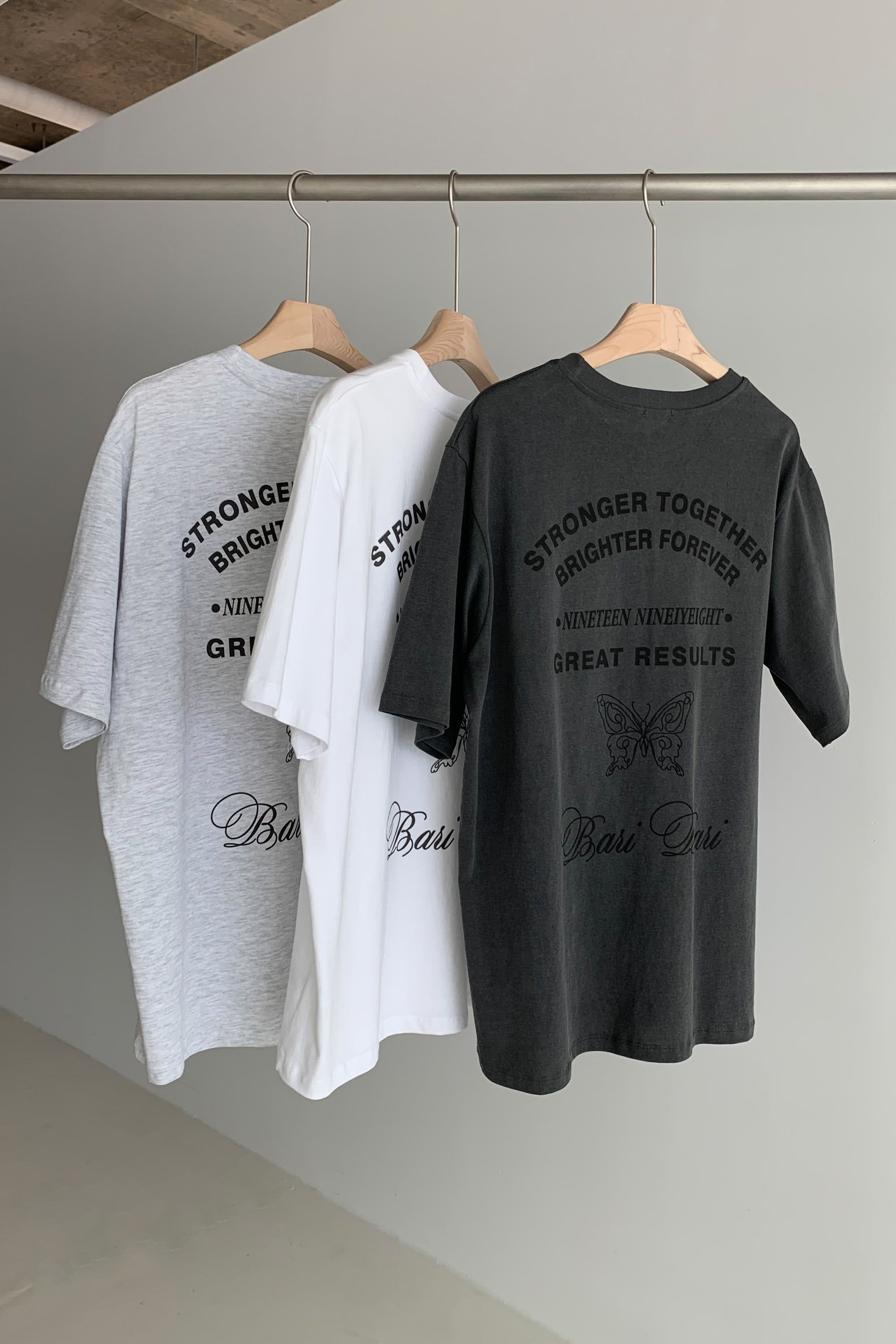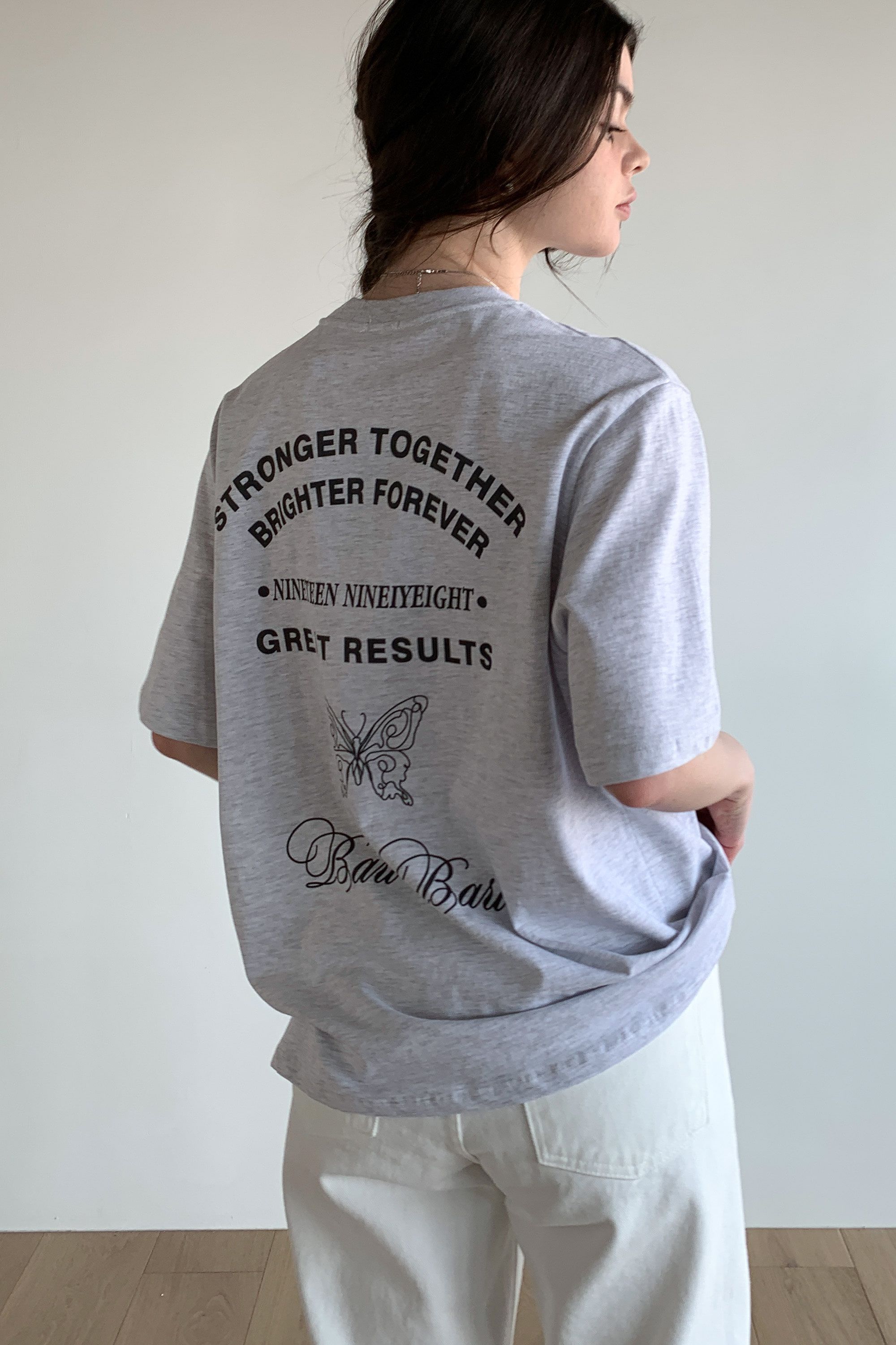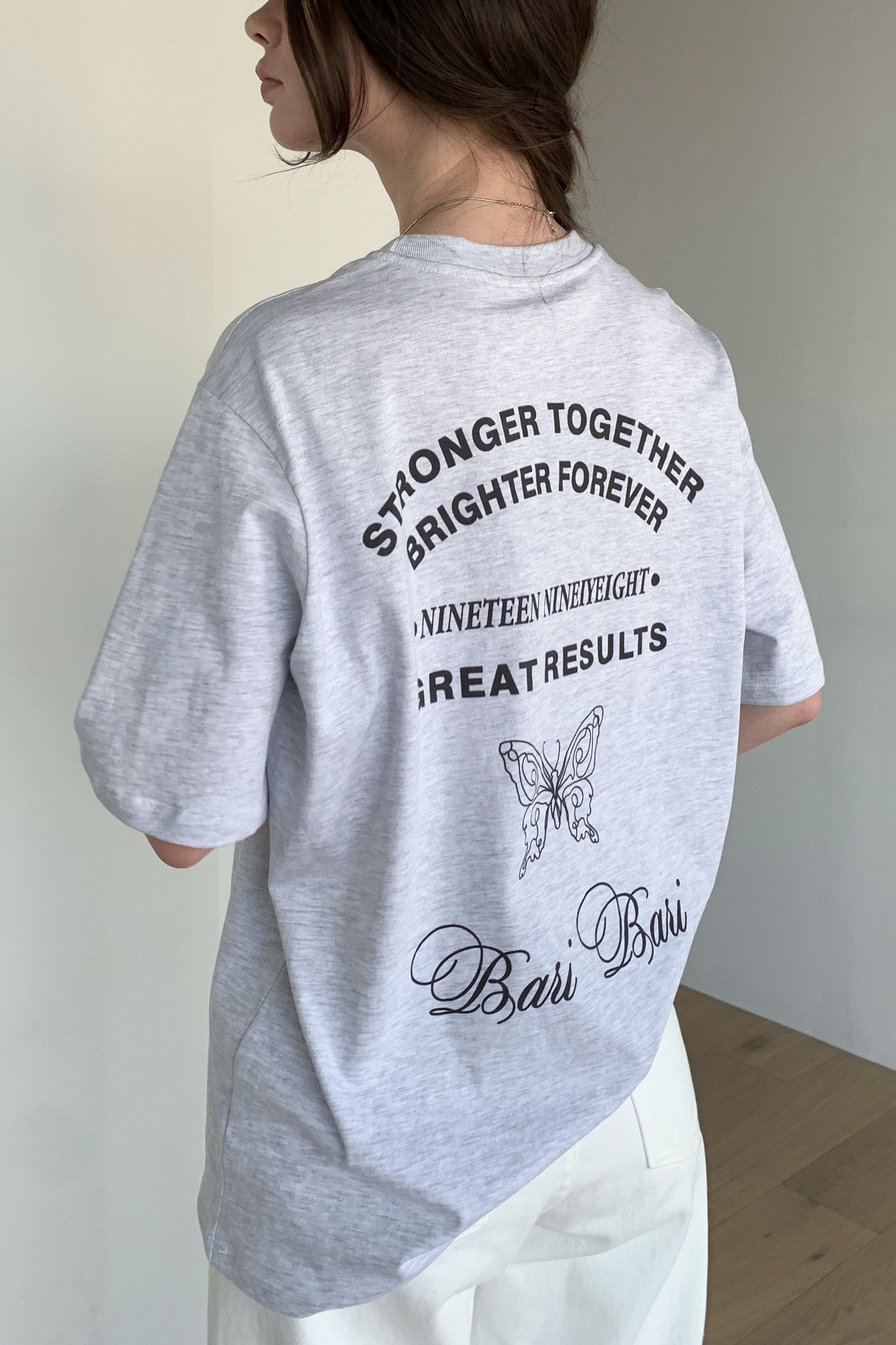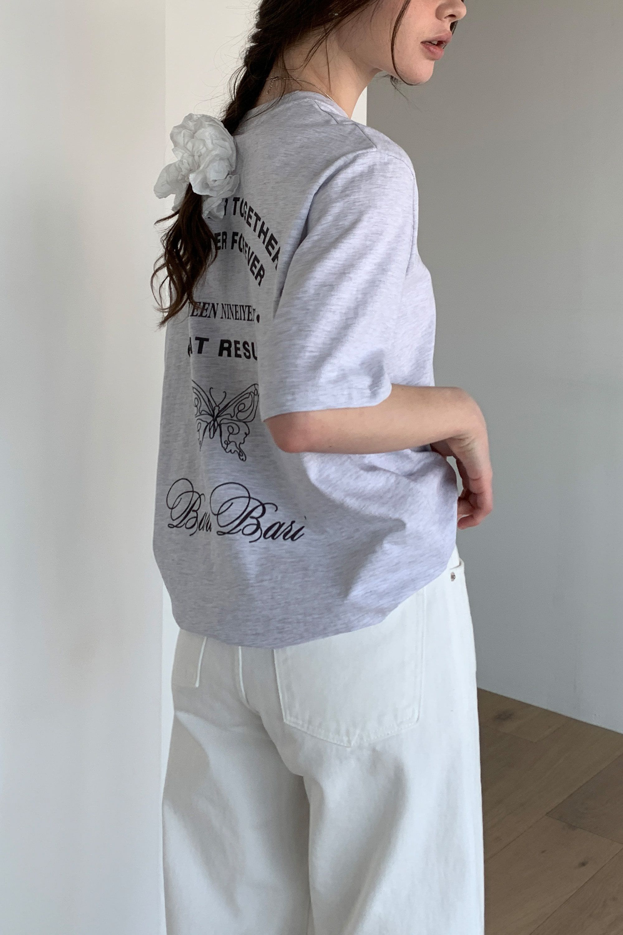 韓國女裝連線 - 背後蝶印美式字短袖上衣-灰白 (FREE)