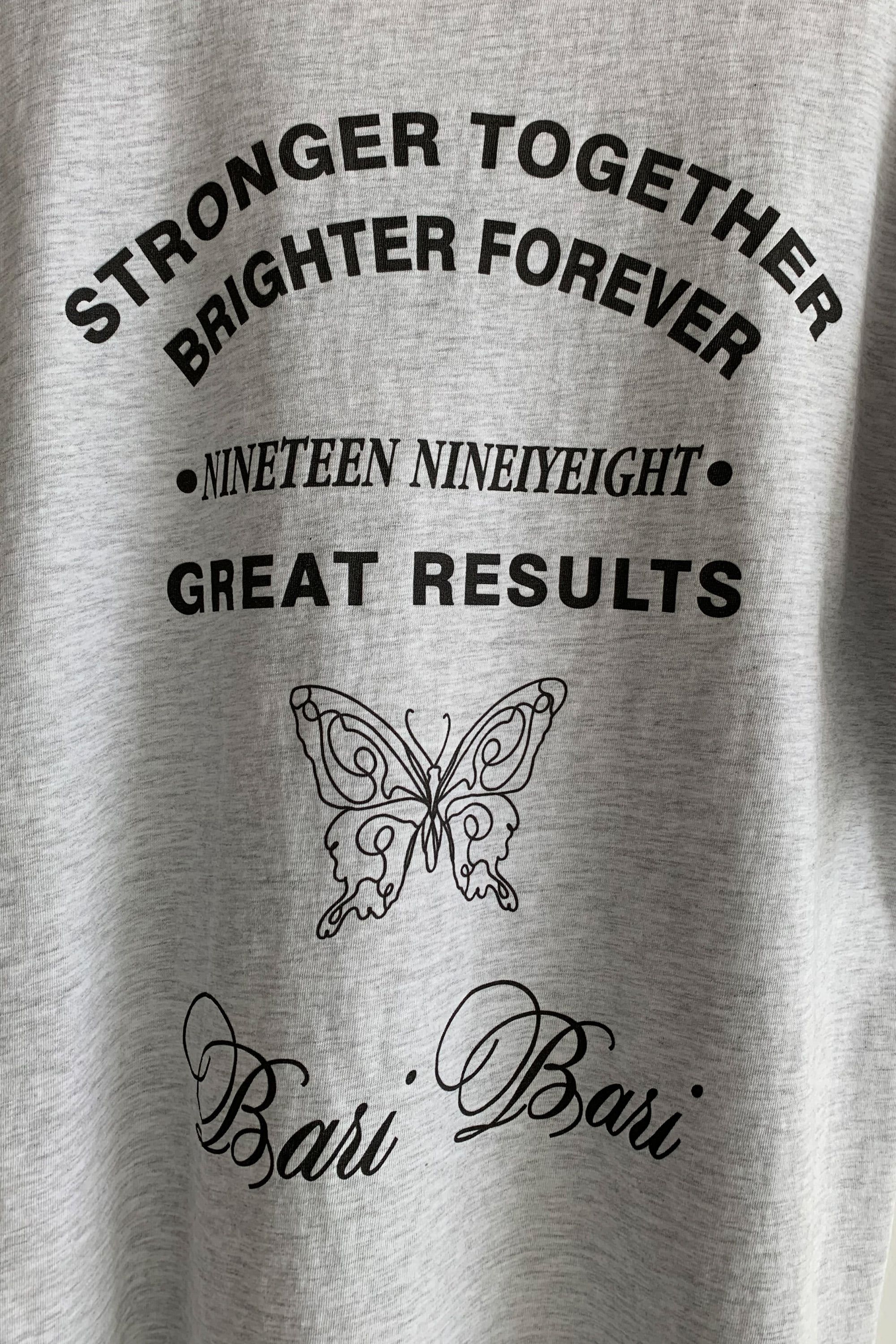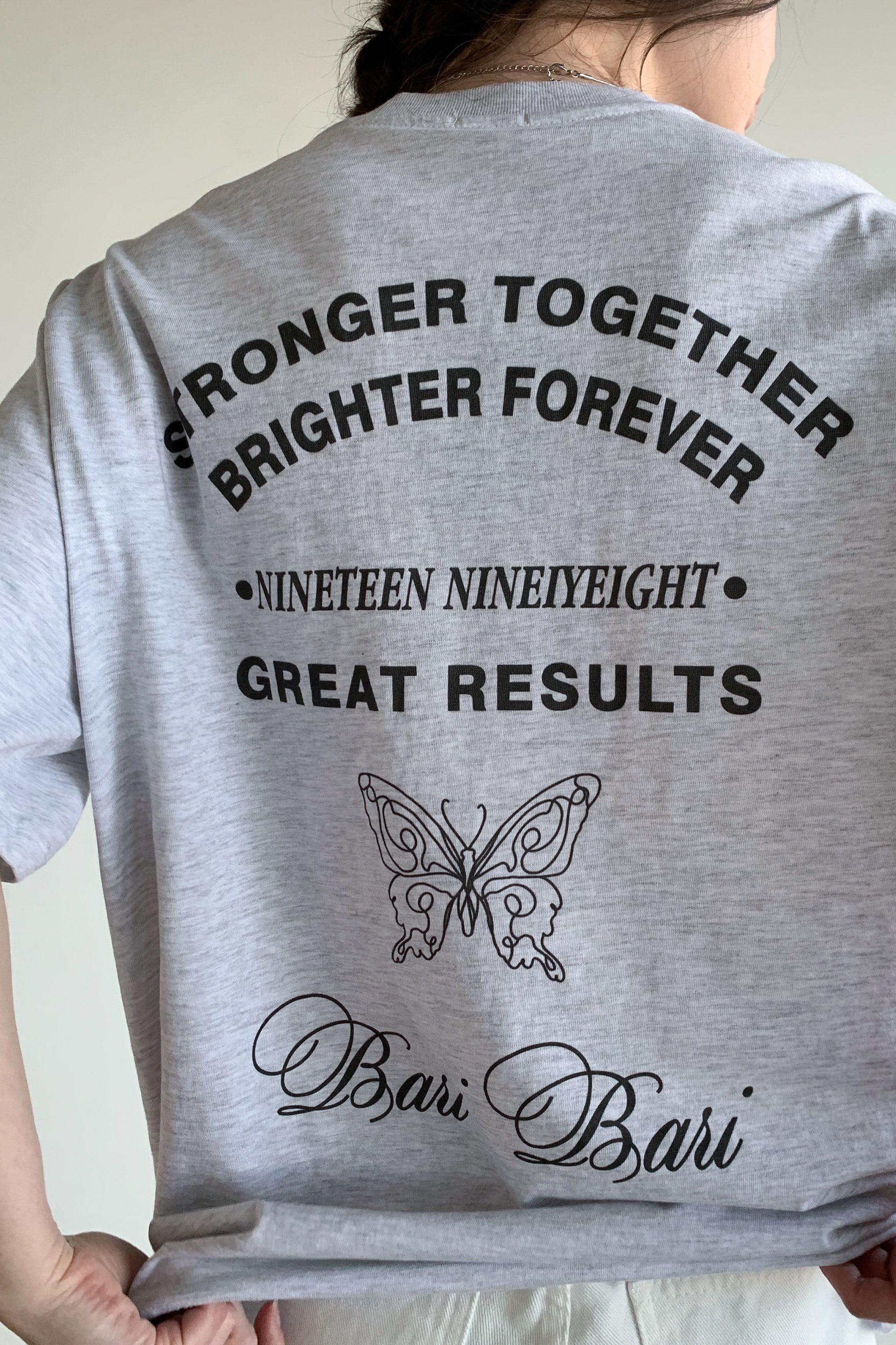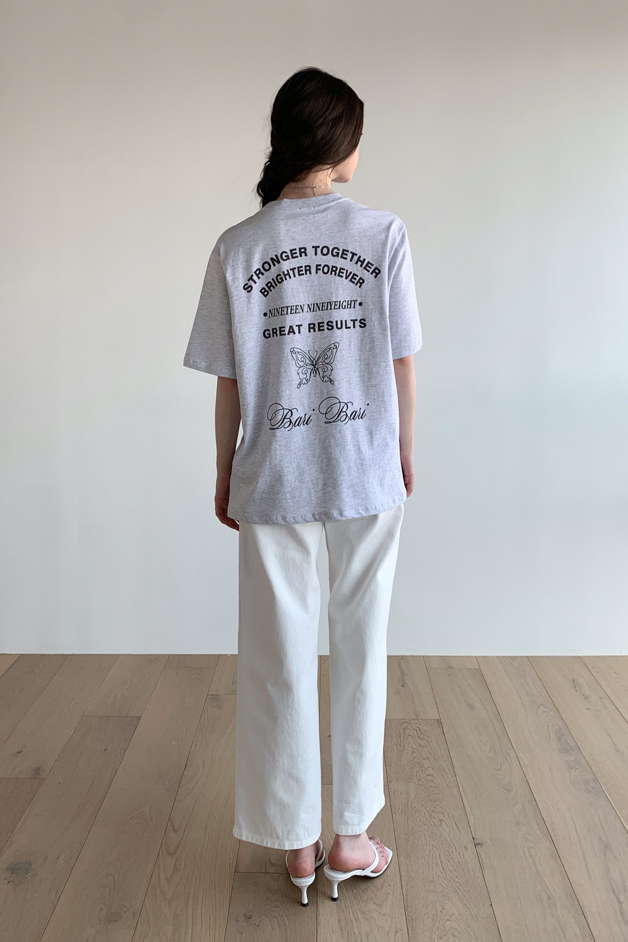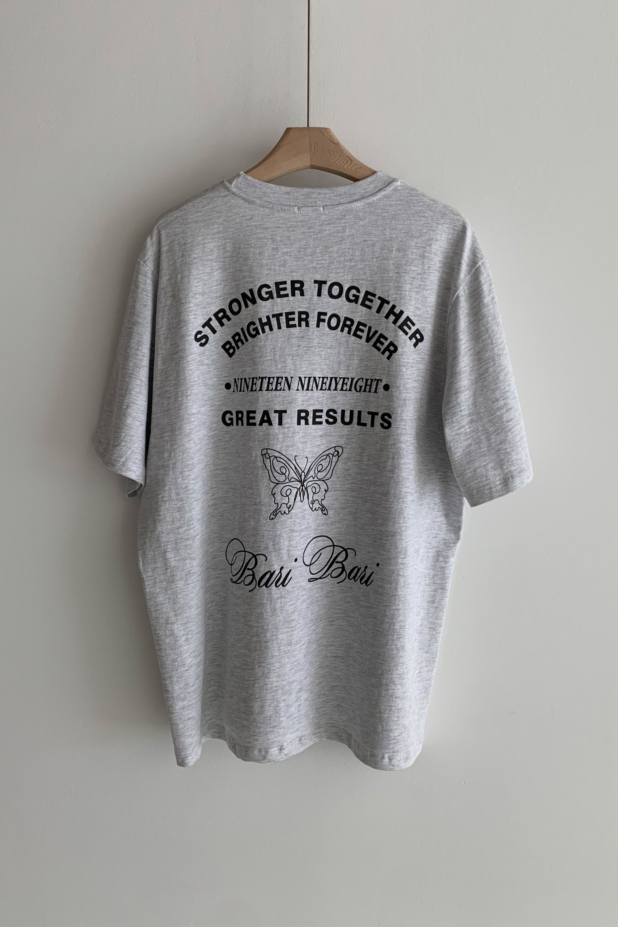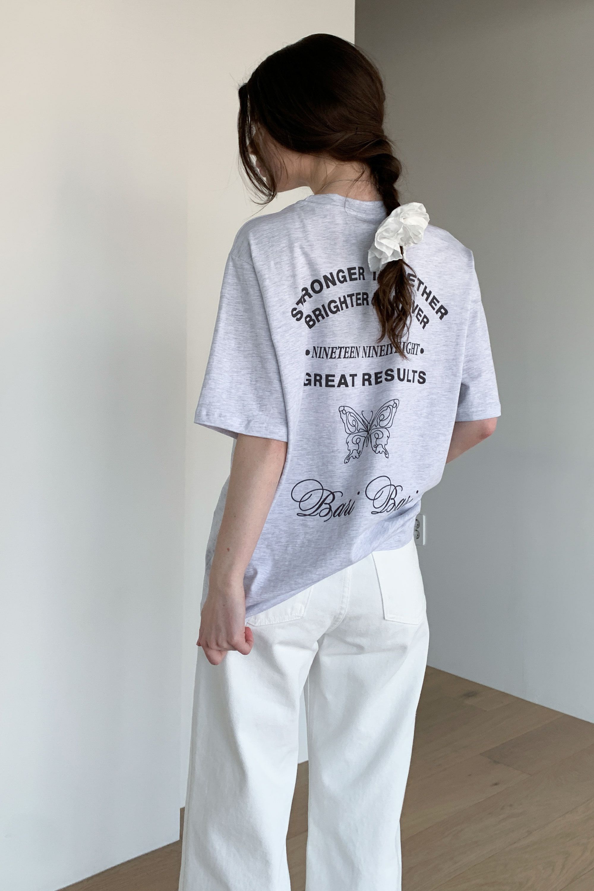 韓國女裝連線 - 背後蝶印美式字短袖上衣-灰白 (FREE)