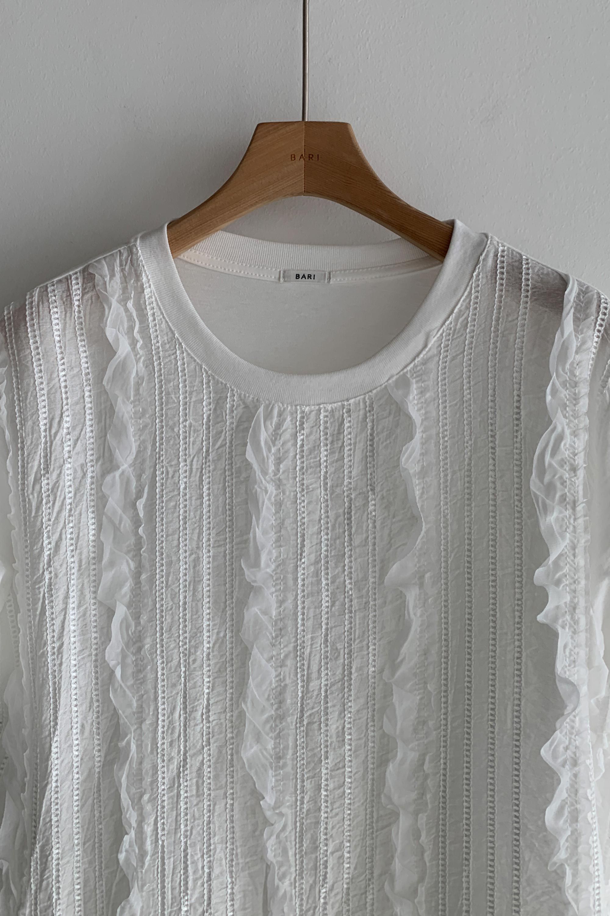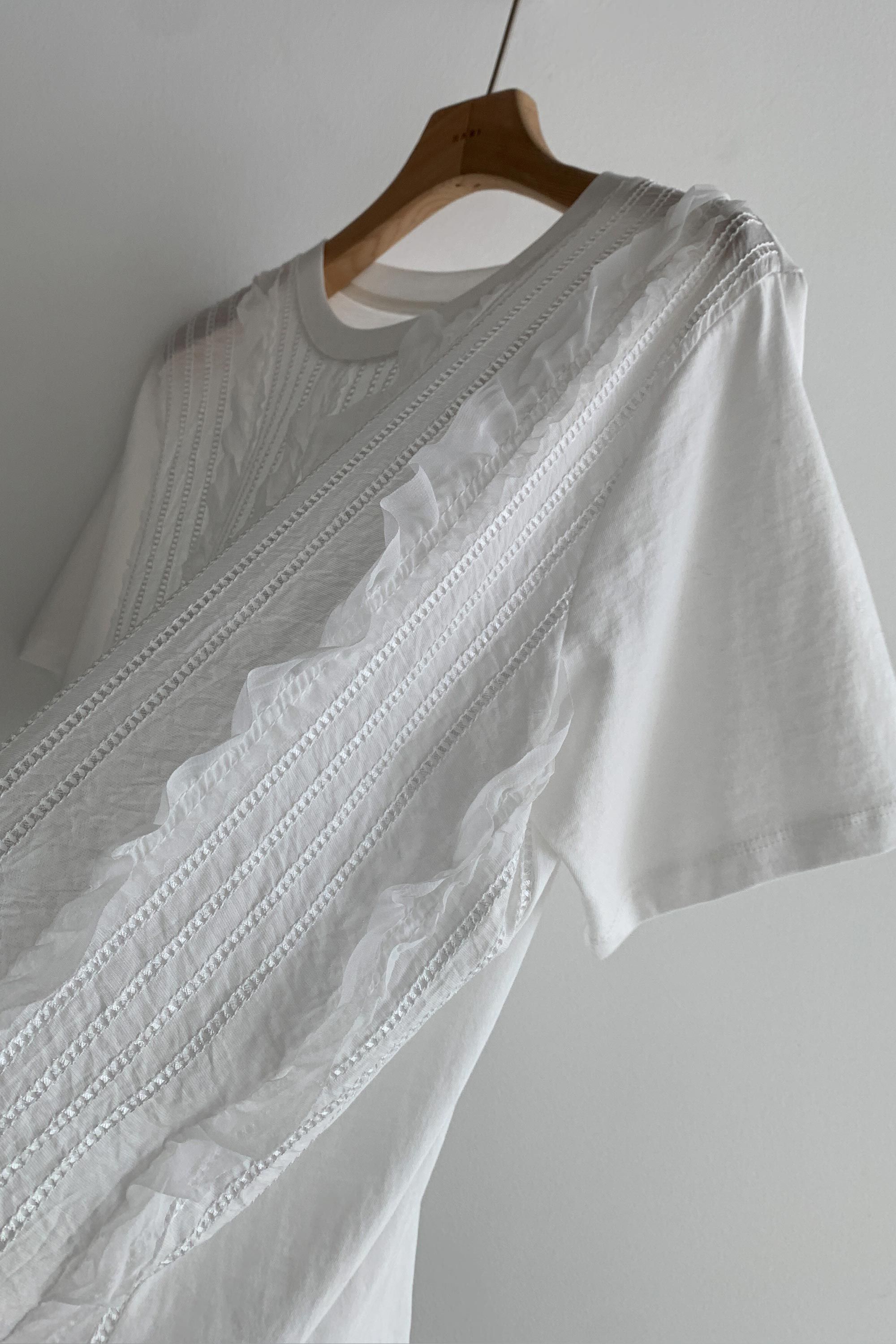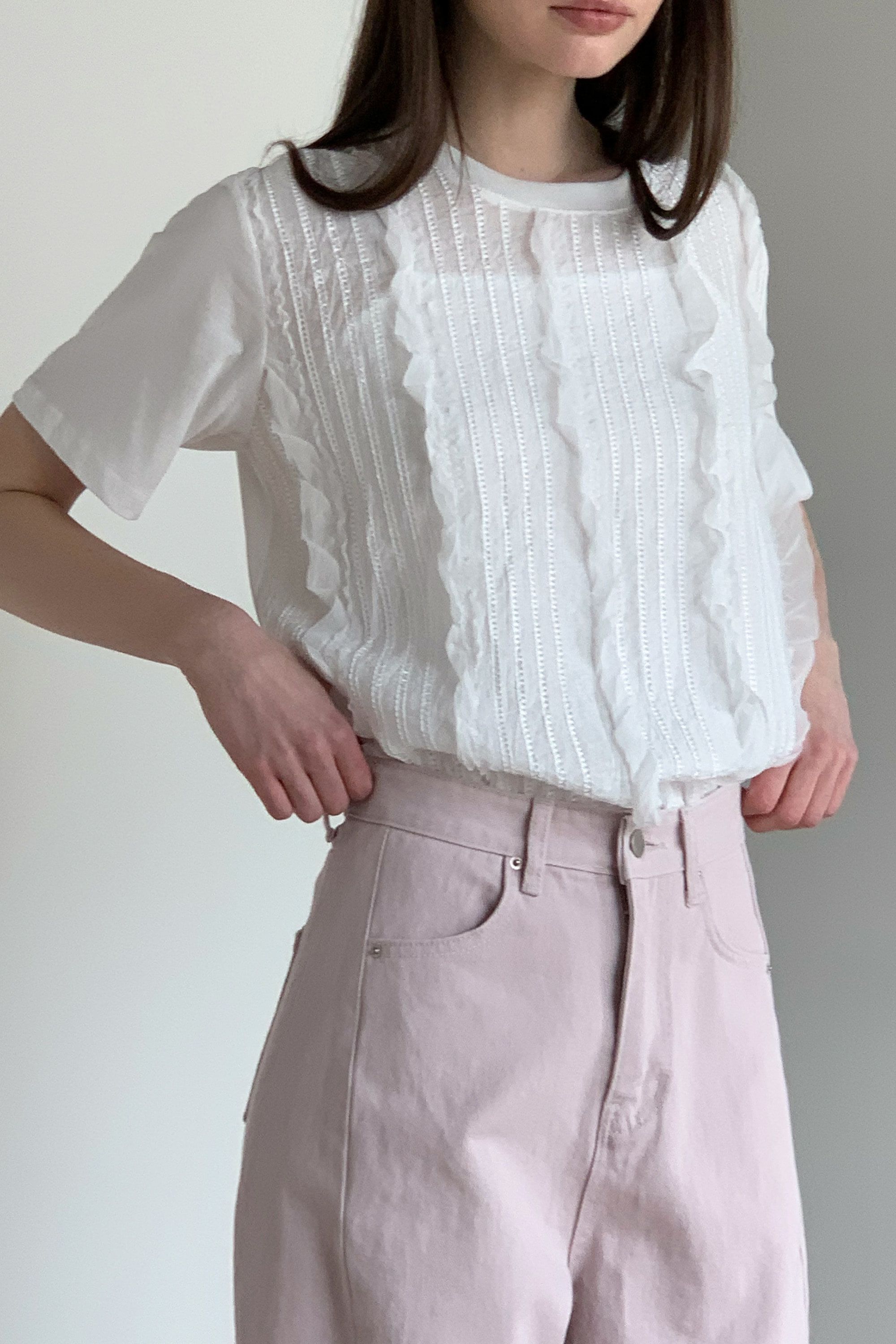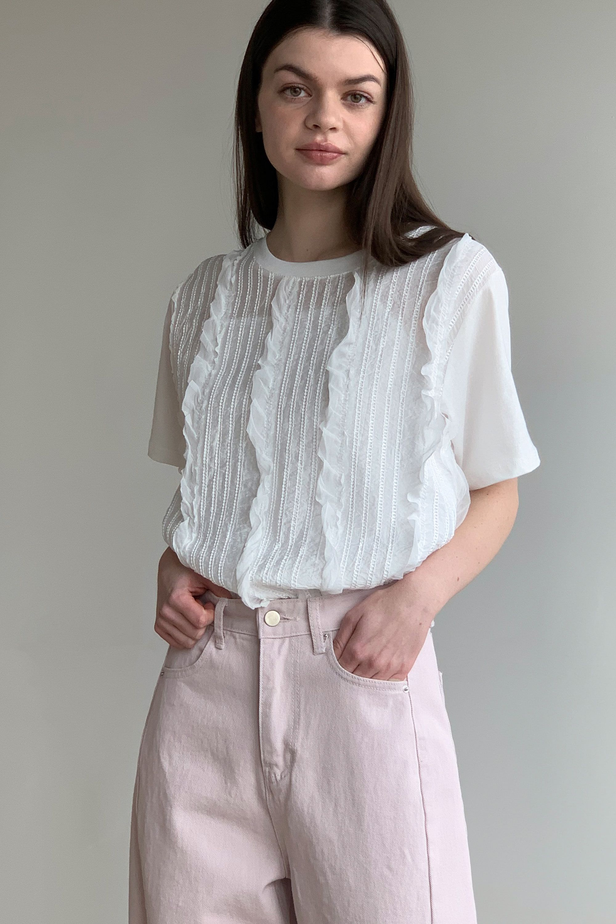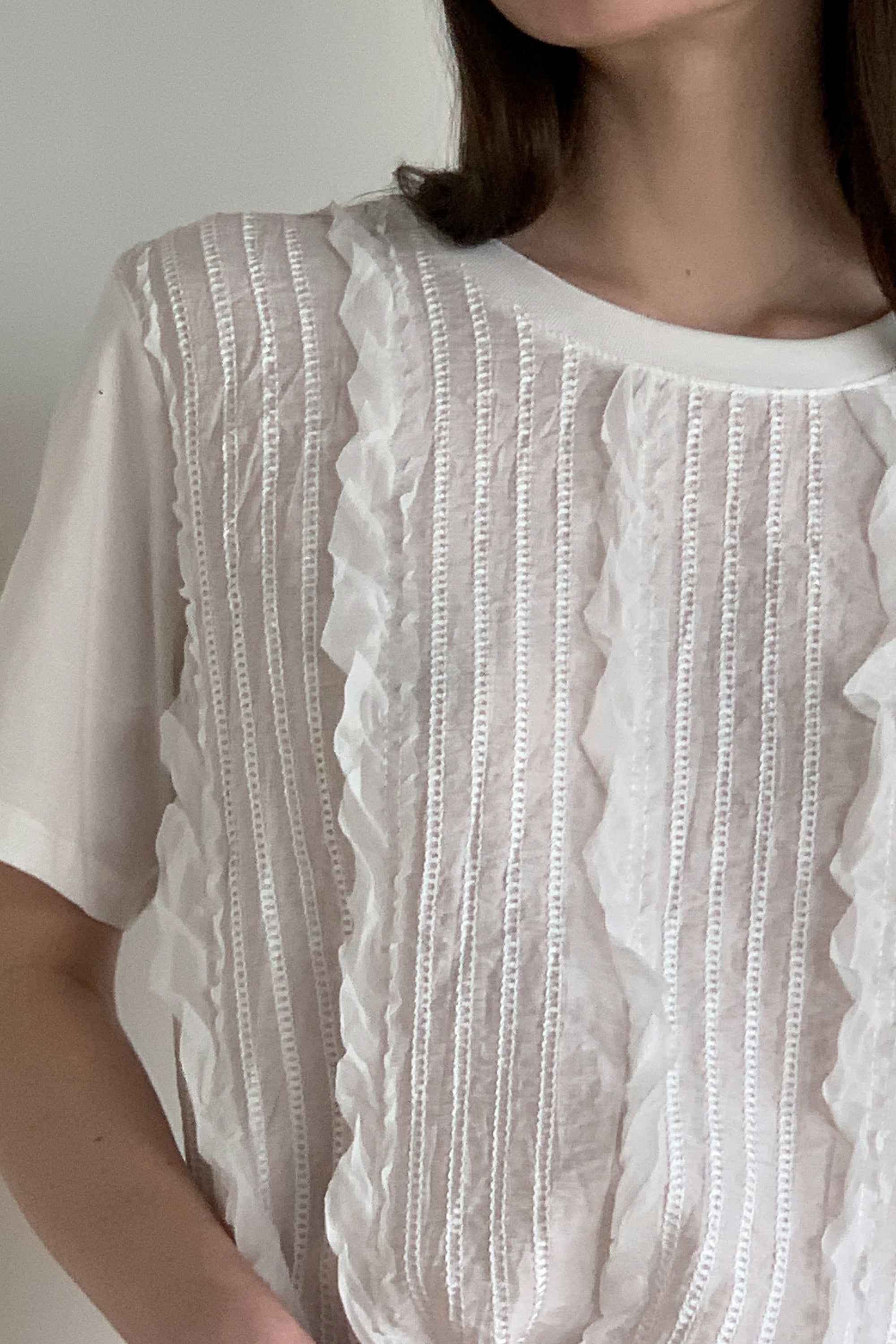 韓國女裝連線 - 蕾絲點綴微透短袖上衣-白 (FREE)