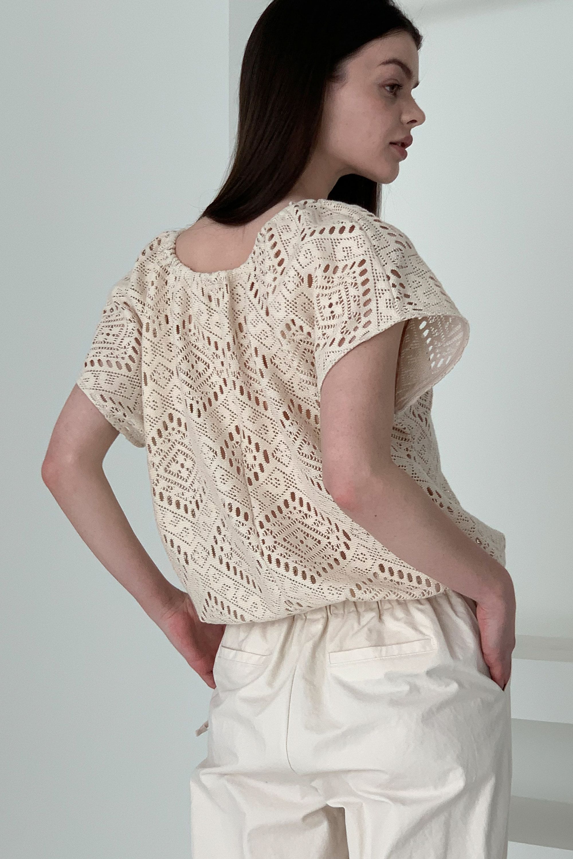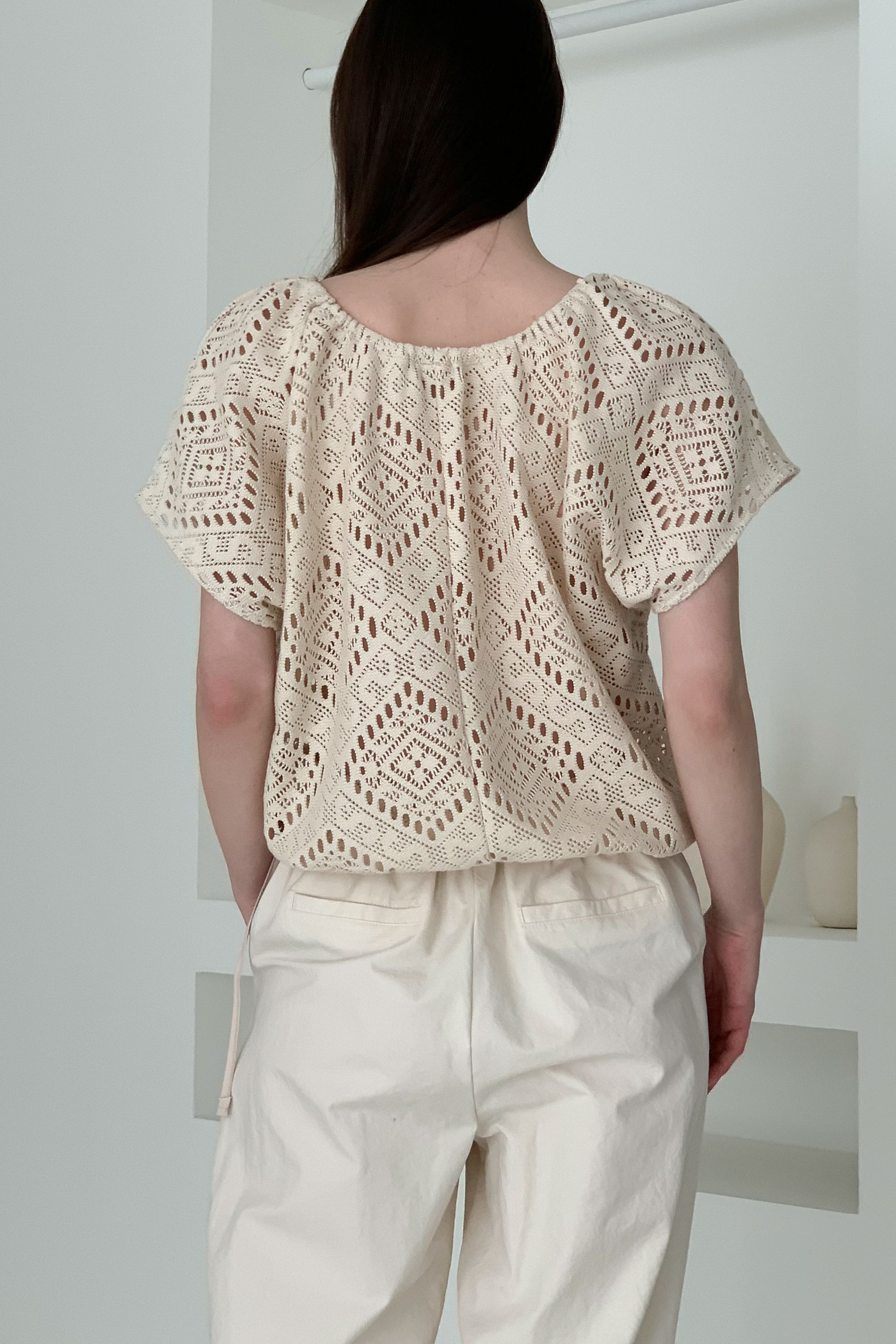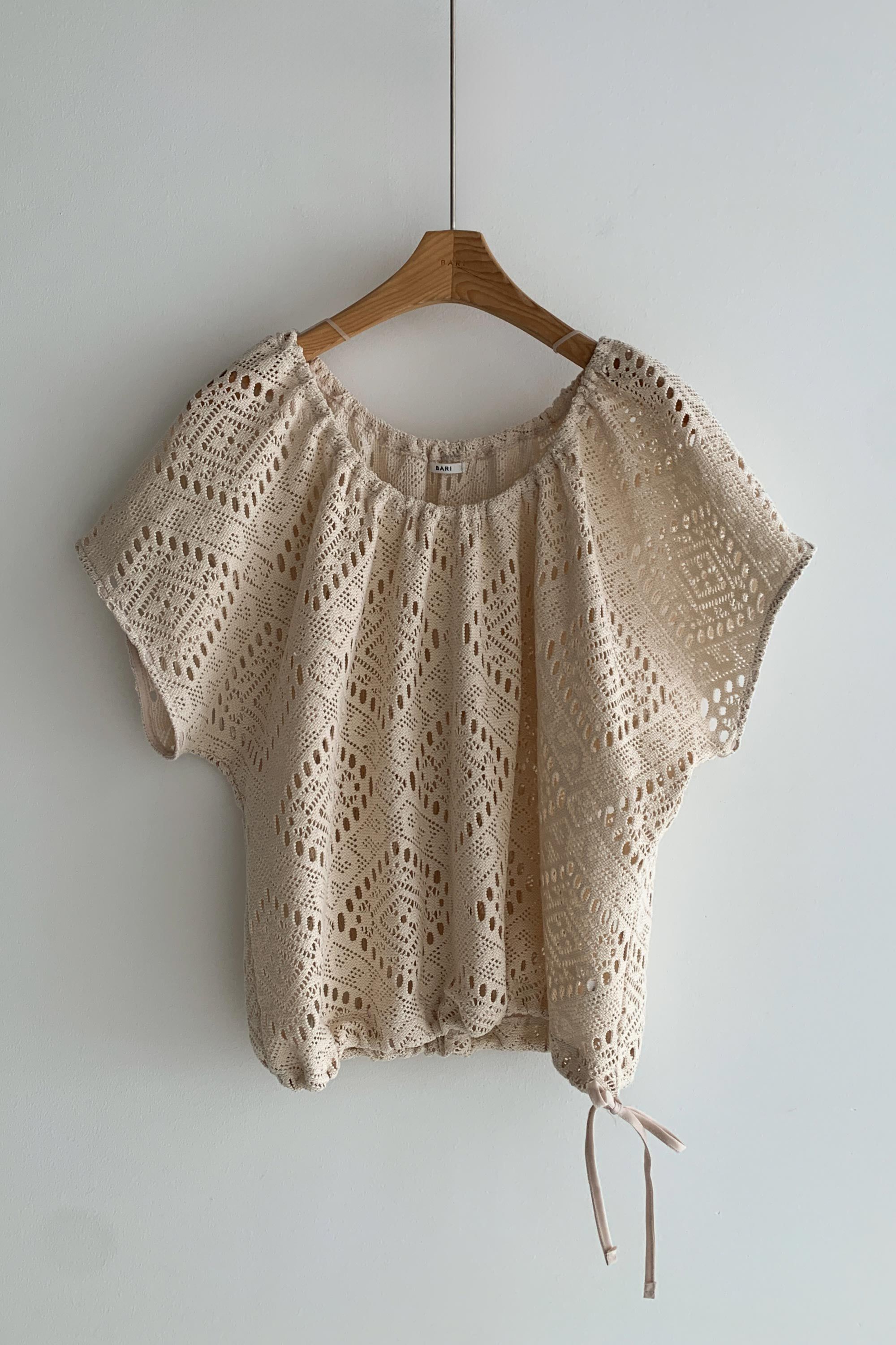 • 品名:風情鏤空下襬抽繩短袖上衣