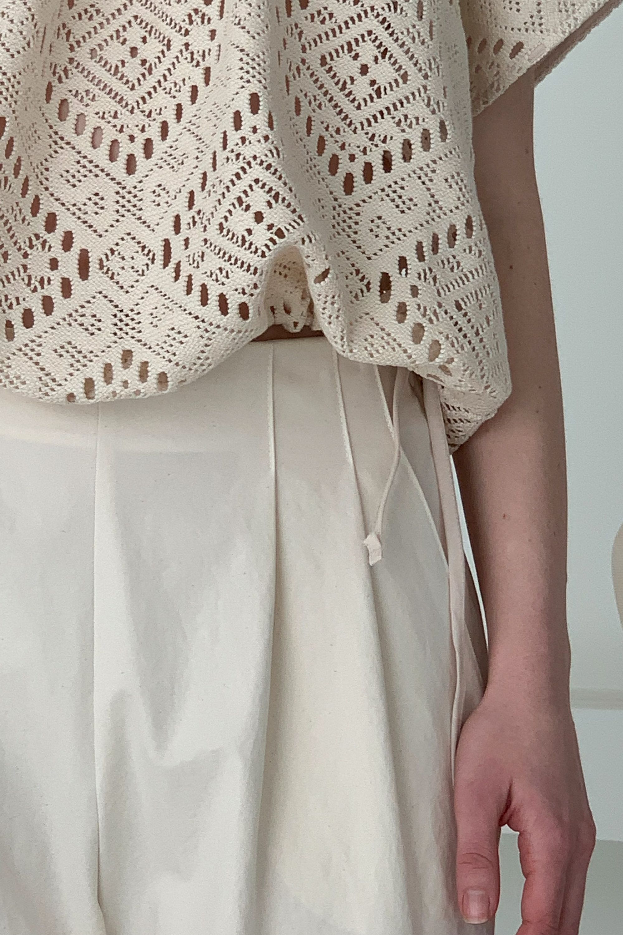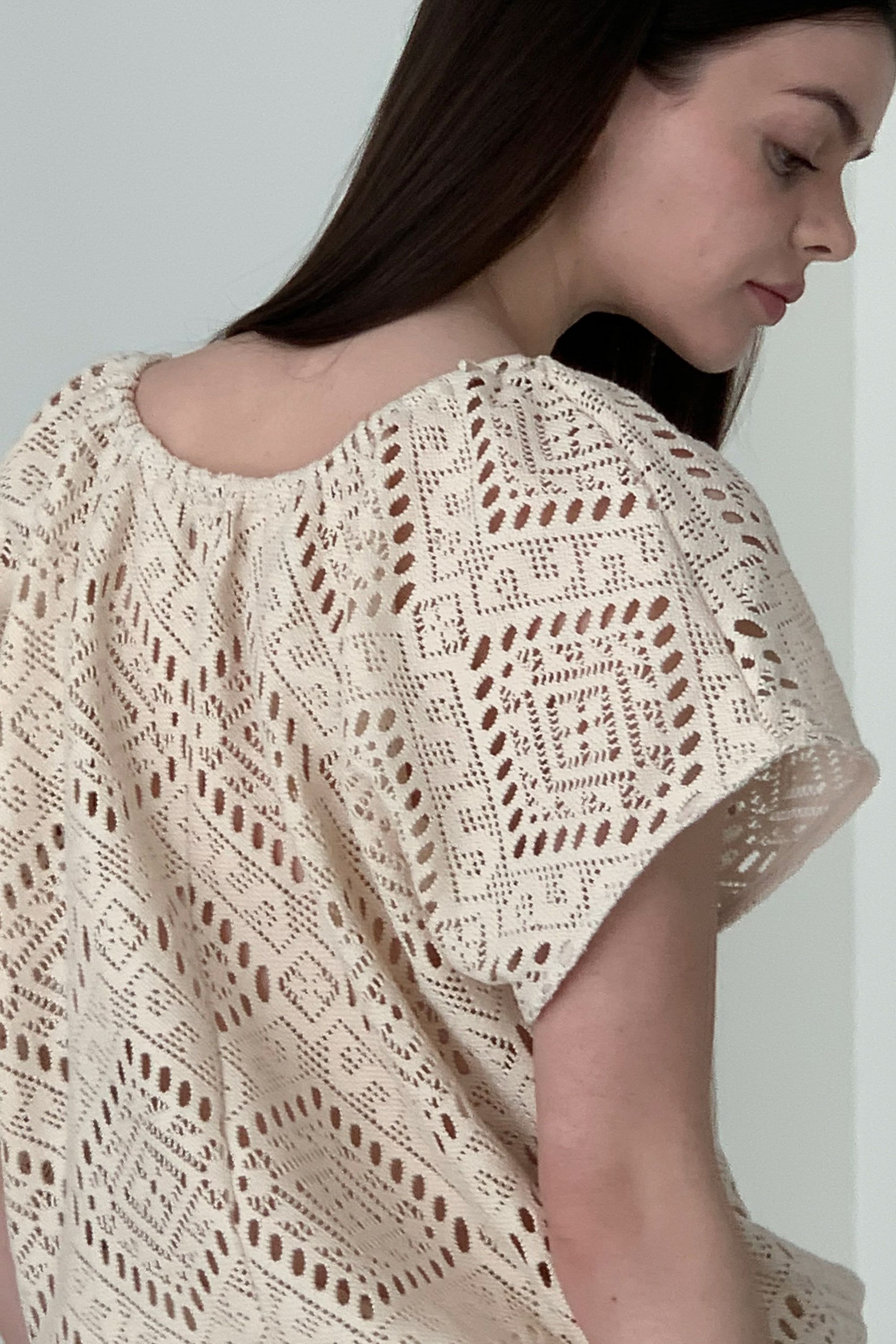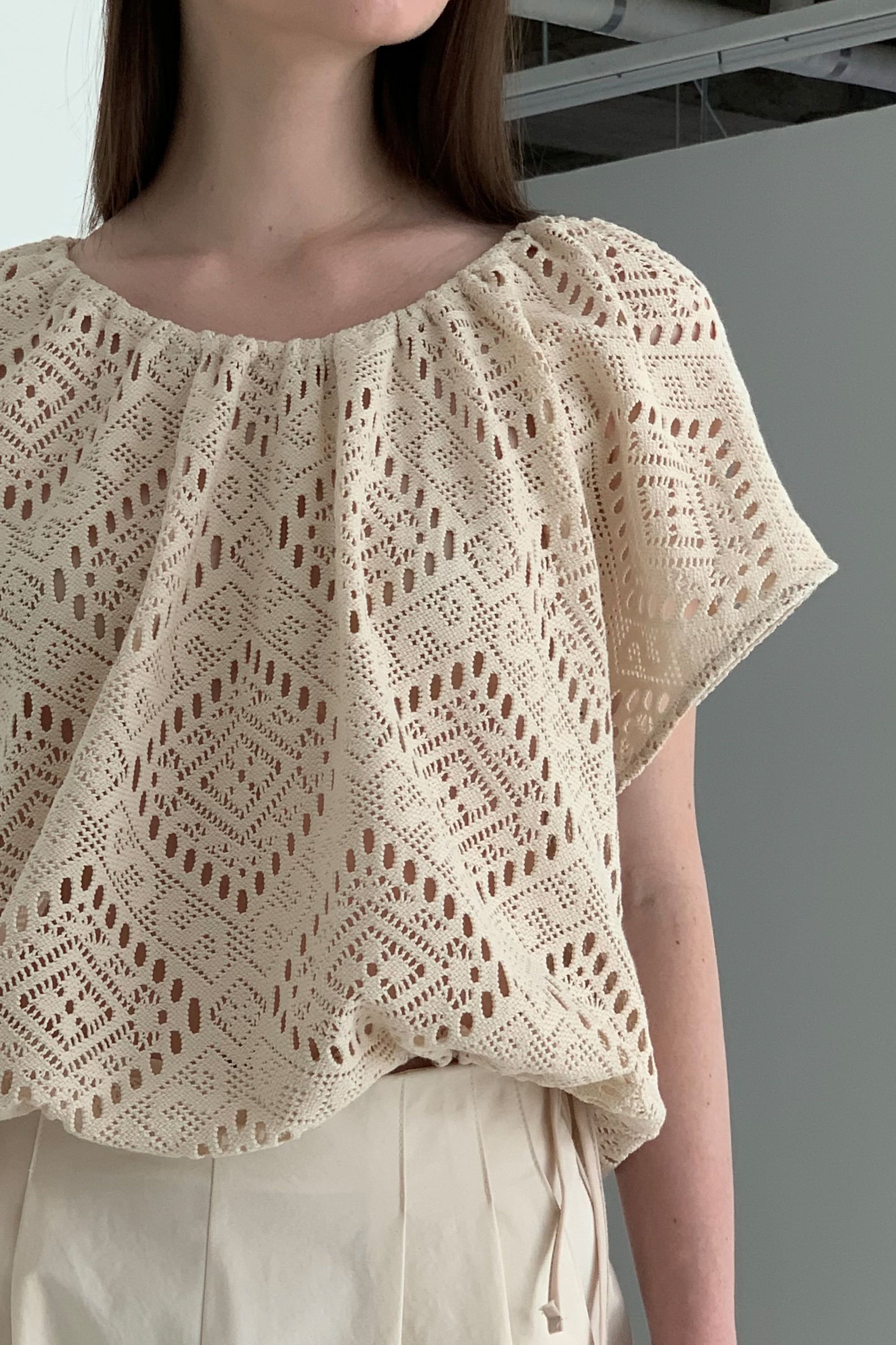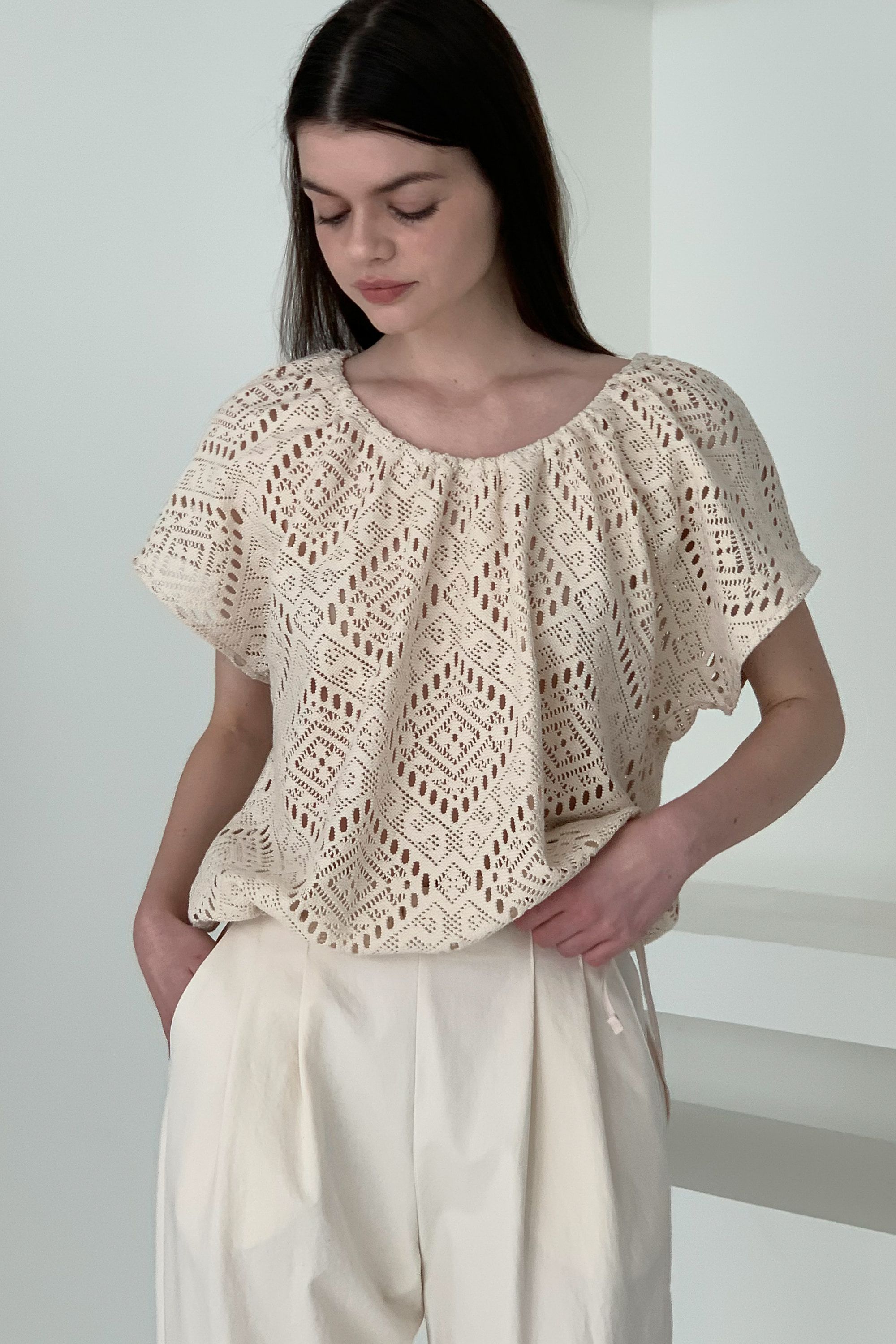 • 品名:風情鏤空下襬抽繩短袖上衣