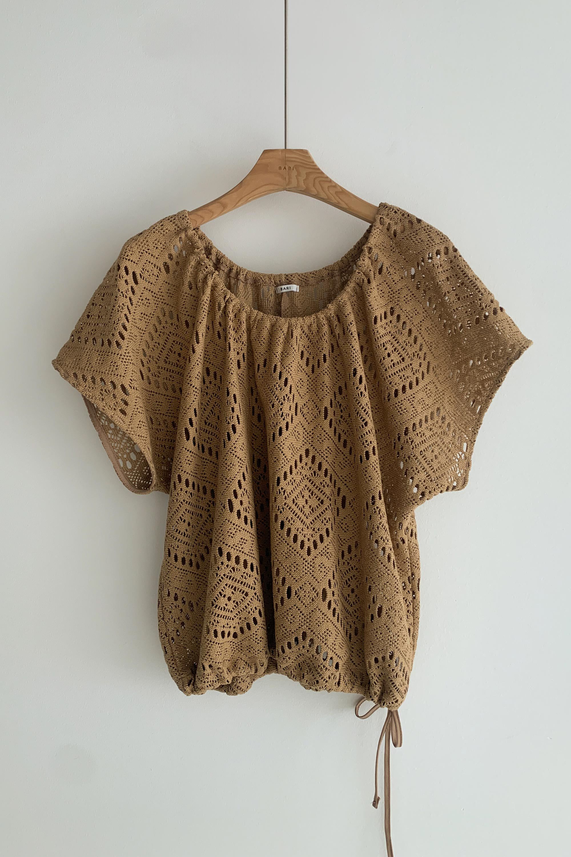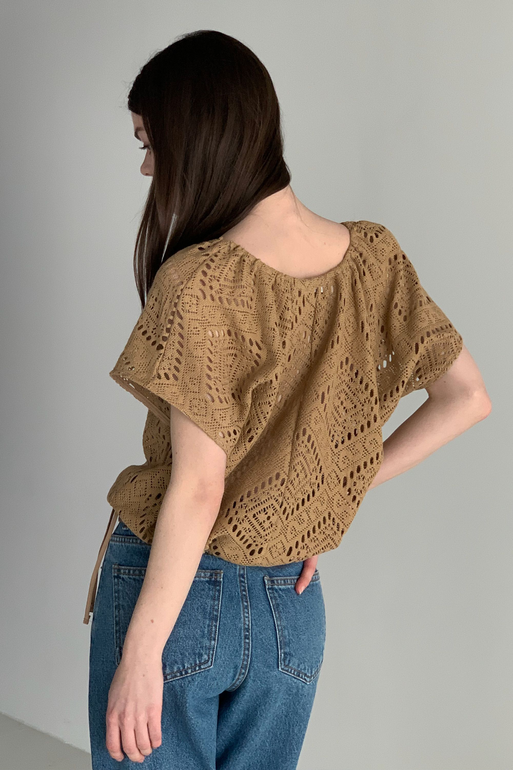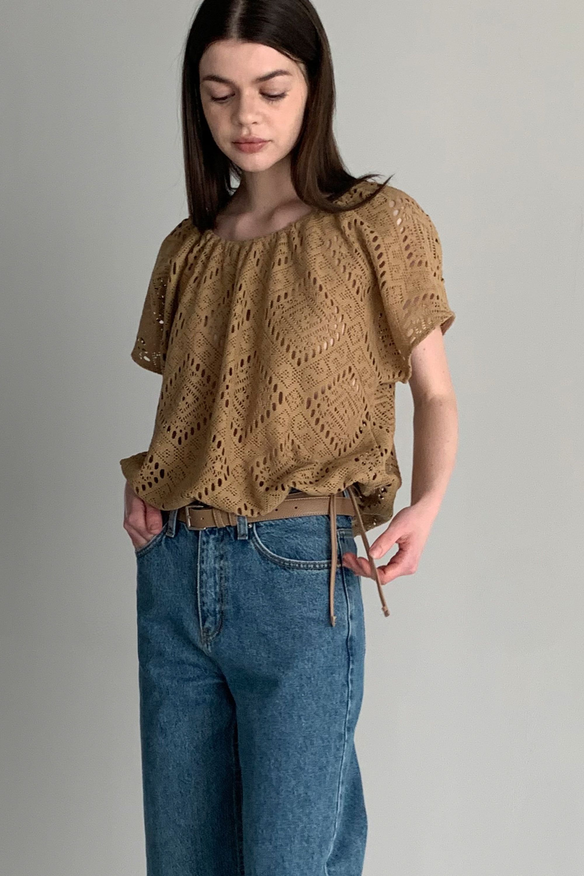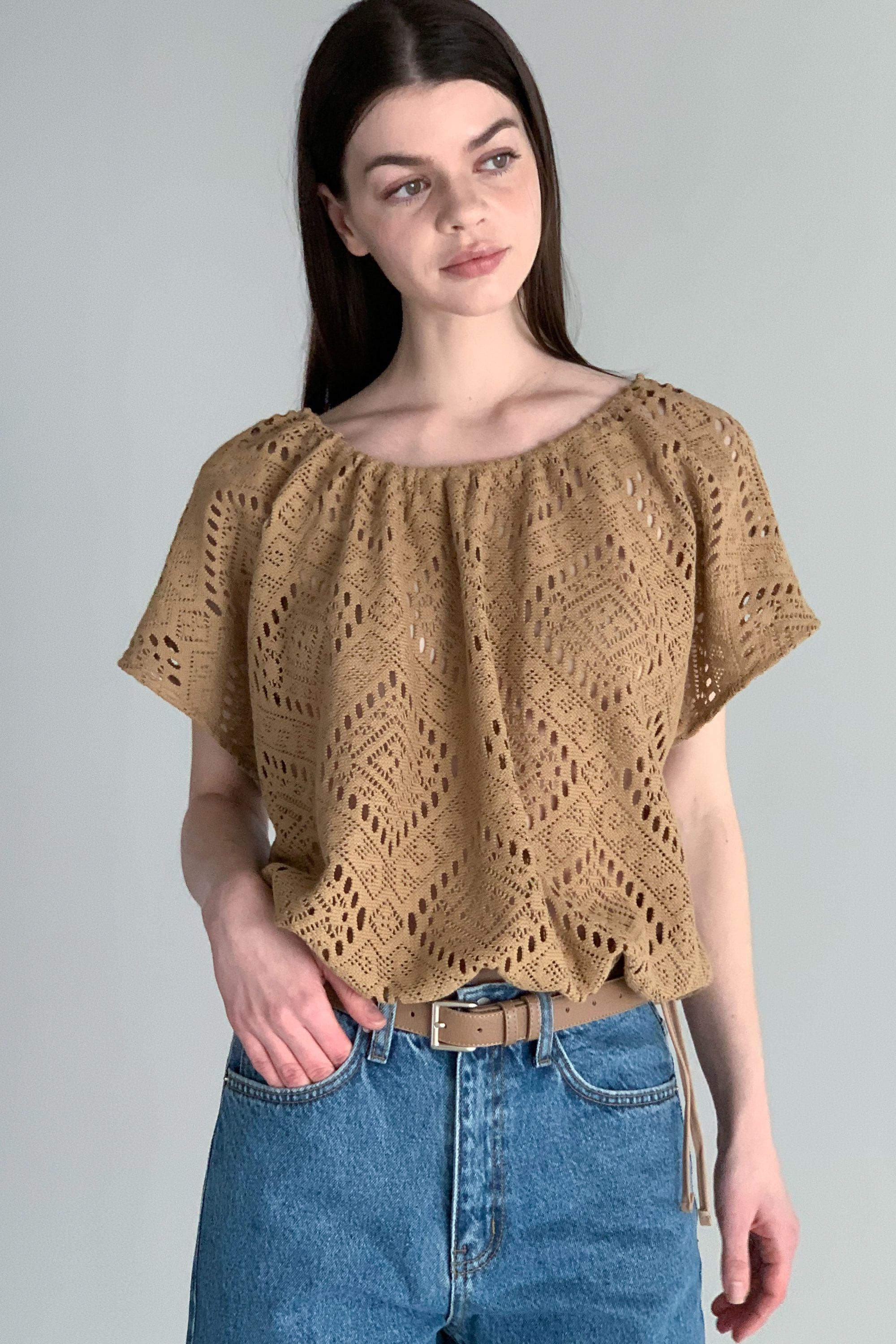 韓國女裝連線 - 風情鏤空下襬抽繩短袖上衣-駝 (FREE)