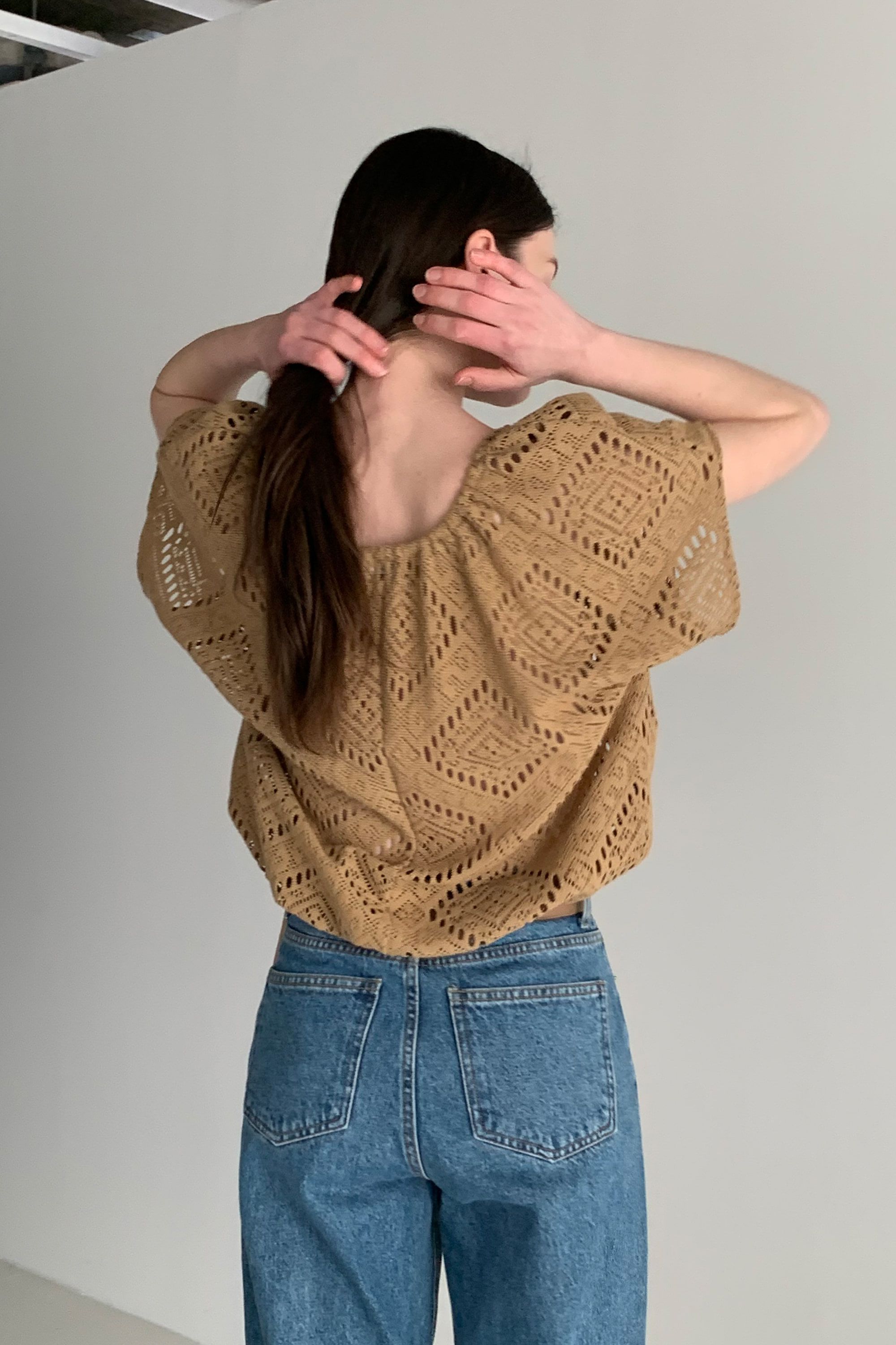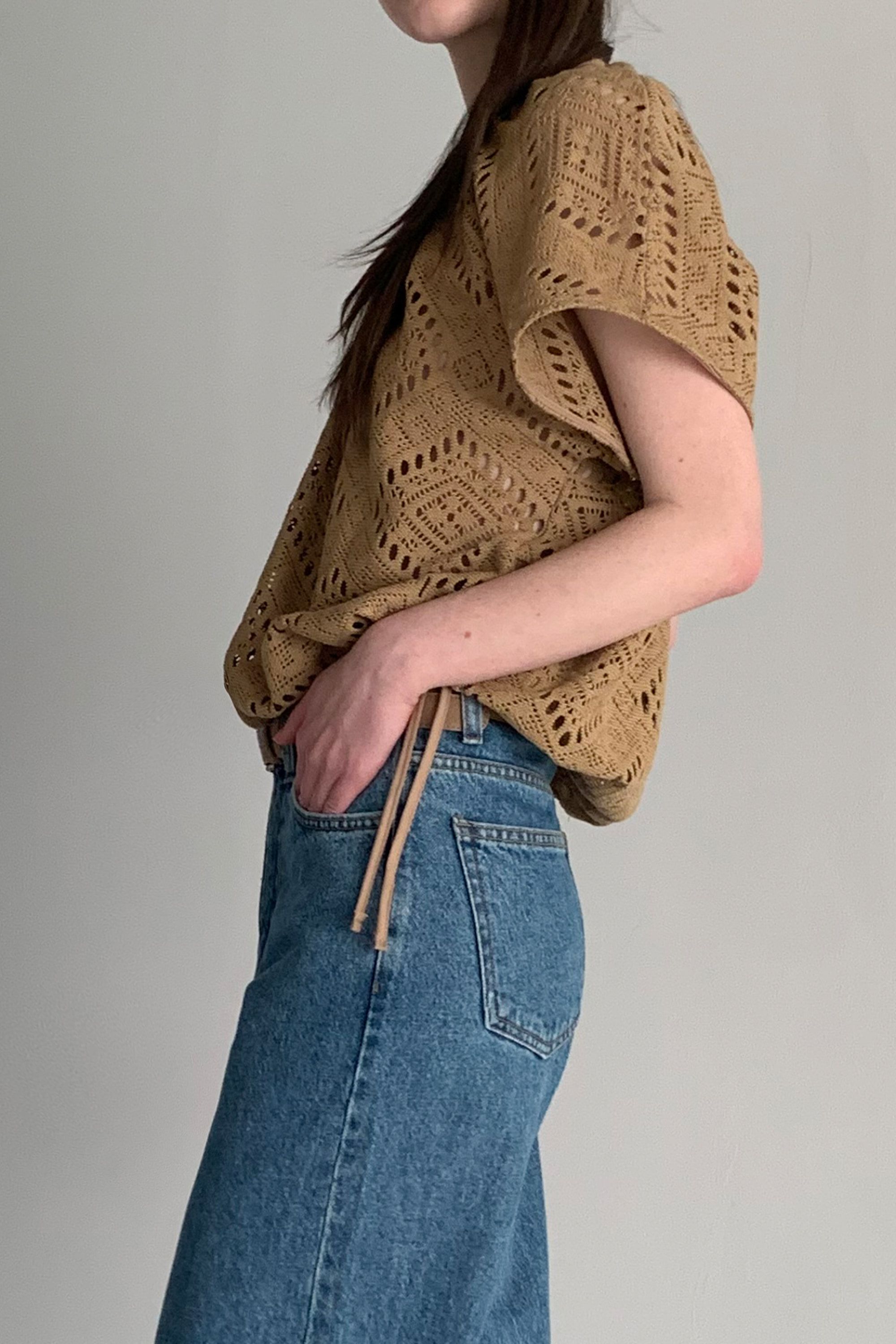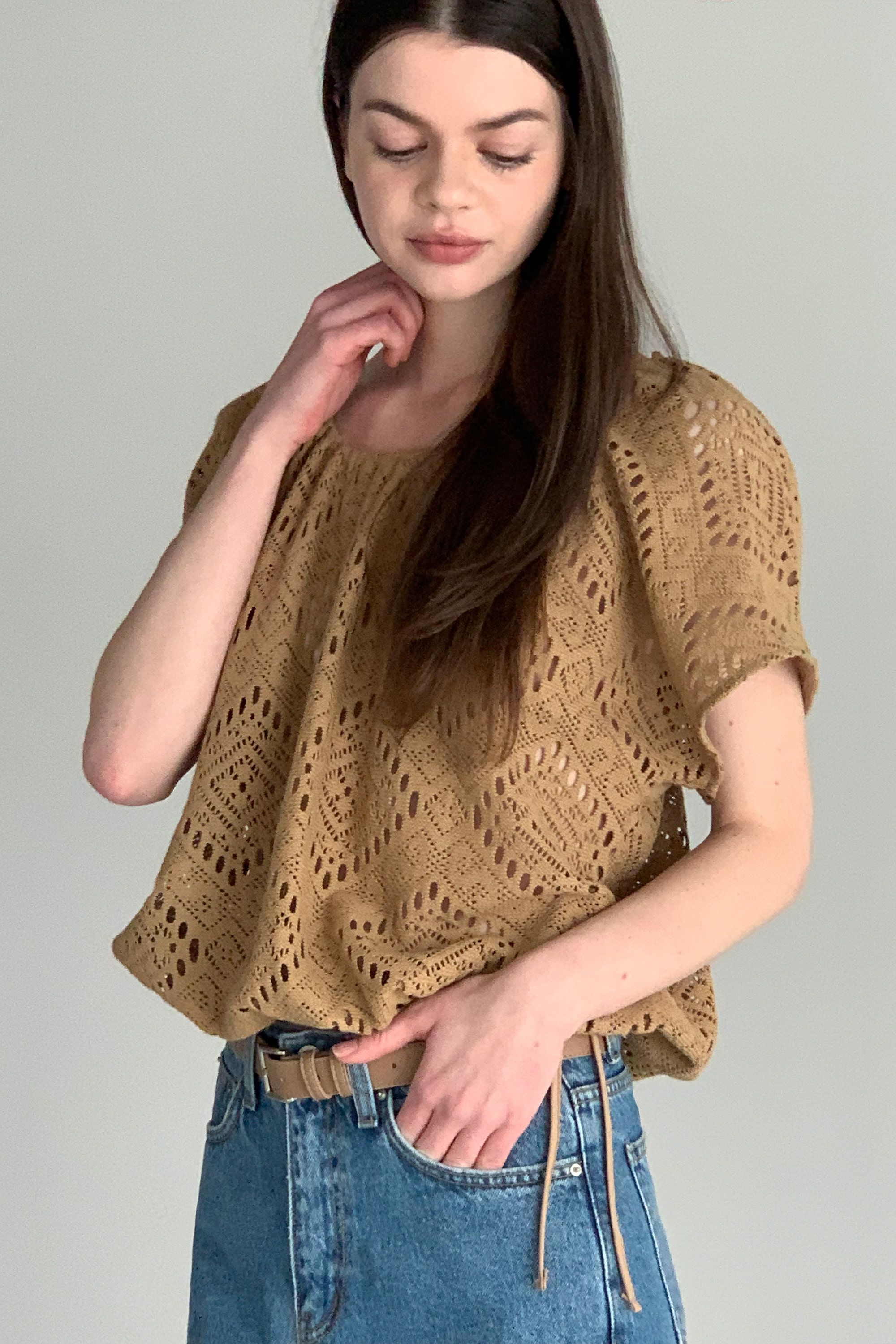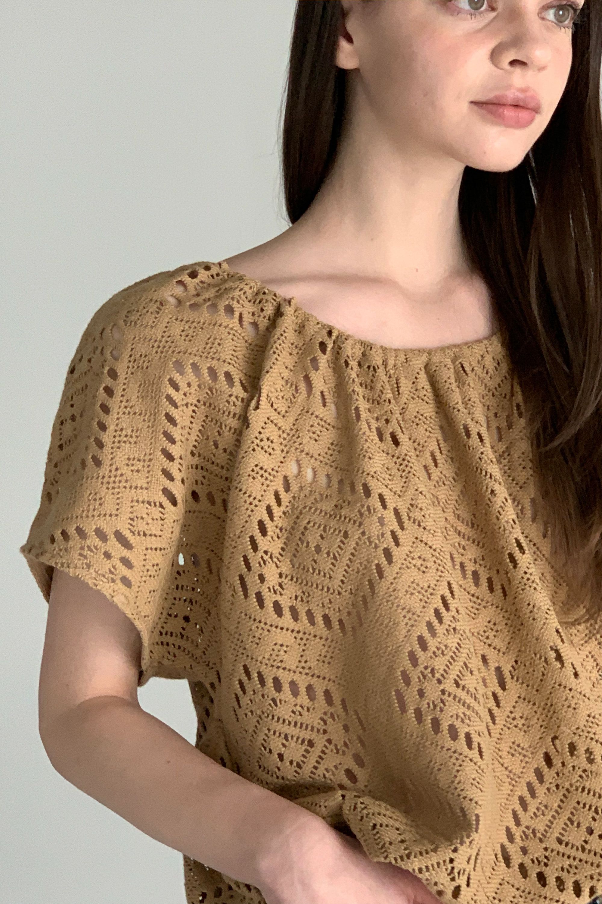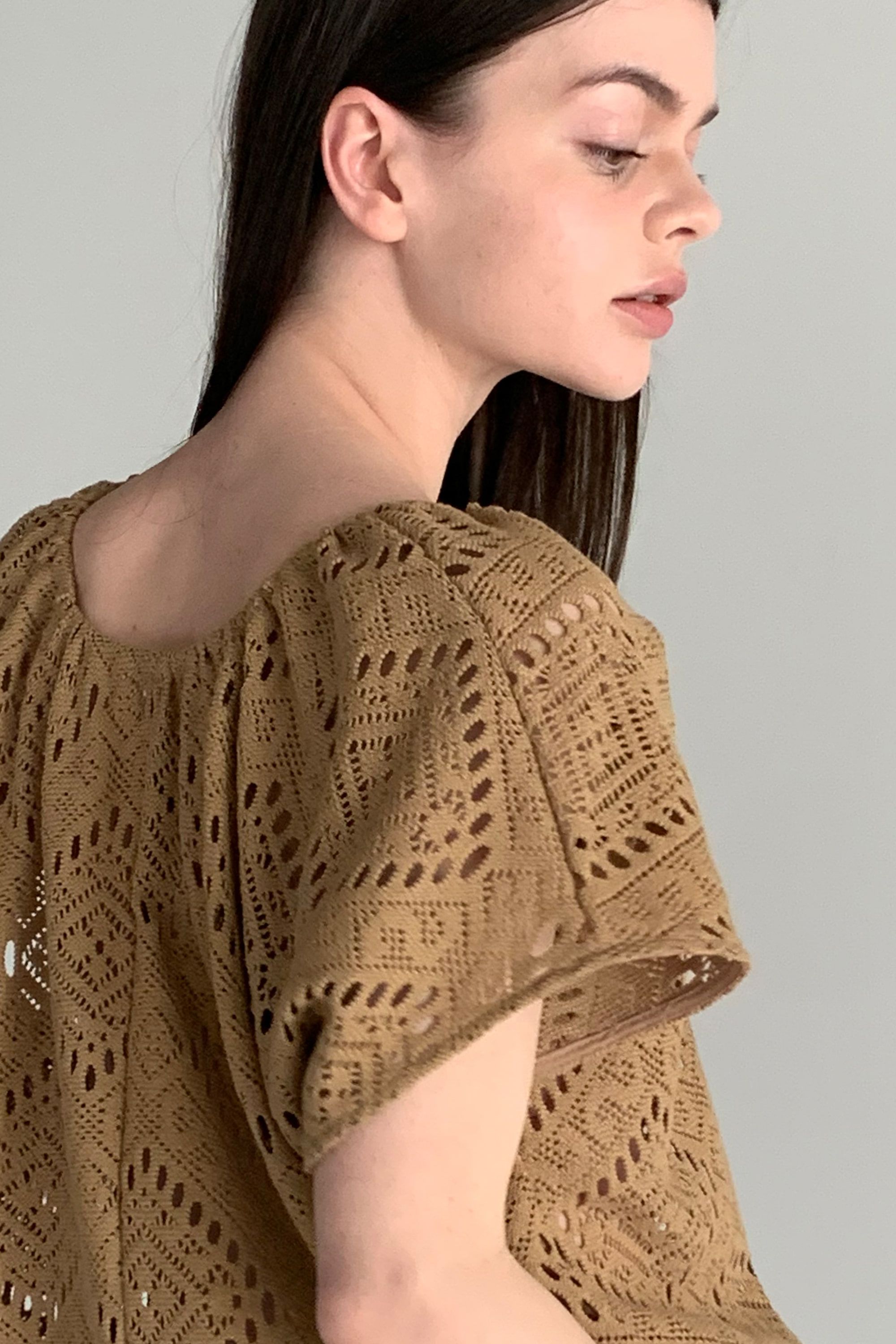 韓國女裝連線 - 風情鏤空下襬抽繩短袖上衣-駝 (FREE)
