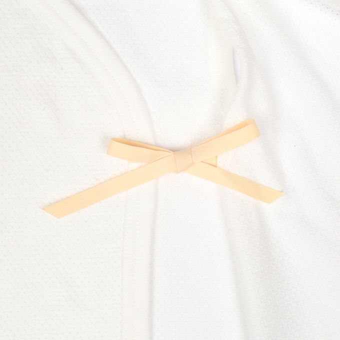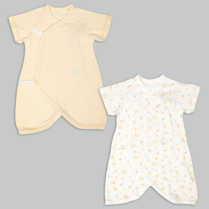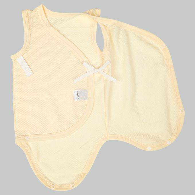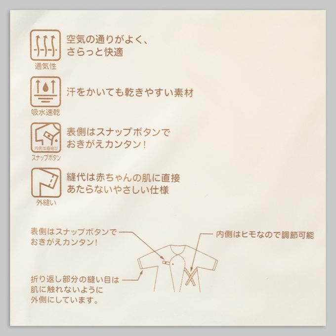 肚衣不只能保暖,還能吸收脖子周圍和腋下的汗水,讓身體保持清潔。蝴蝶裝與肚衣一起穿,並扣上內側的釦子,即可讓活力充沛的小寶寶即使舞動雙腳,下擺也不易敞開。組合裡還有可將小寶寶包覆住的胸前交叉款包屁衣。袖口及下擺等的縫線設計在外側,不會直接接觸到小寶寶的肌膚。