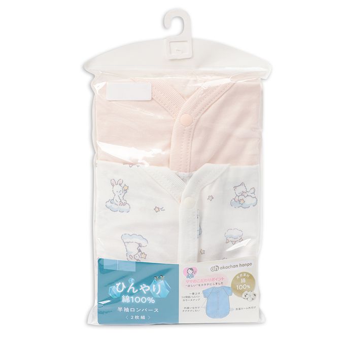 akachan honpo - 短袖包屁衣2件組涼爽純棉-前開式 動物-粉紅色