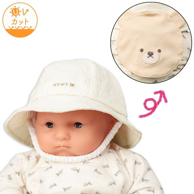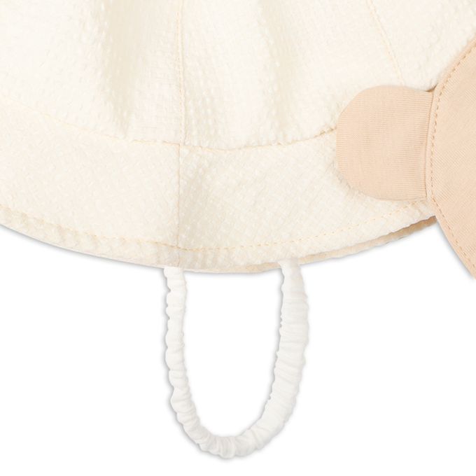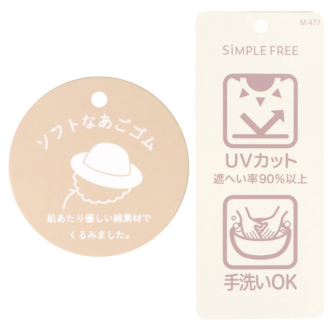 下巴有鬆緊帶可防止被風等吹落。下巴鬆緊帶用布料裹住,使膚觸更舒適。