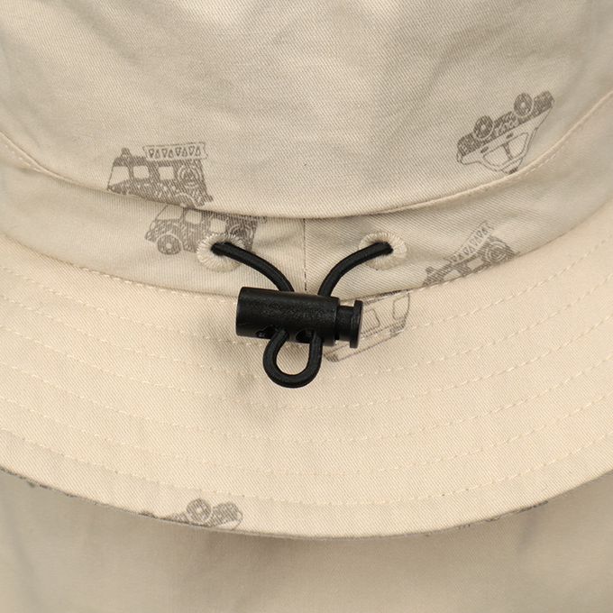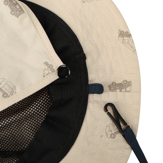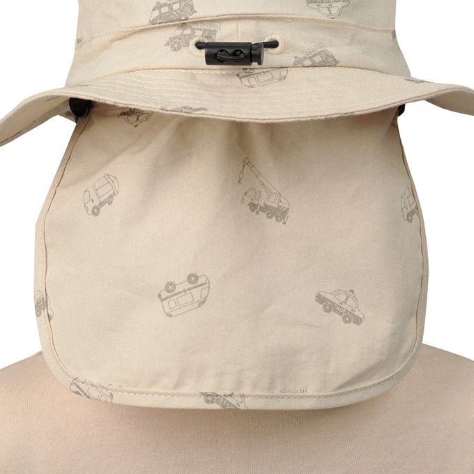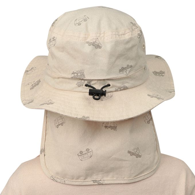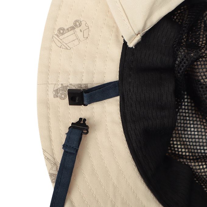有附外出活動時非常需要的防曬遮陽布。附有可防止被風等吹落的下巴繩帶。