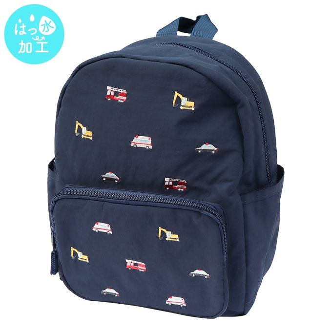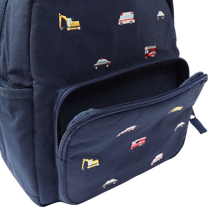 不同顏色的背包搭配不同的刺繡圖案。粉紅色款為水果圖案,綠色款為動物圖案,深藍色款為工程車圖案。