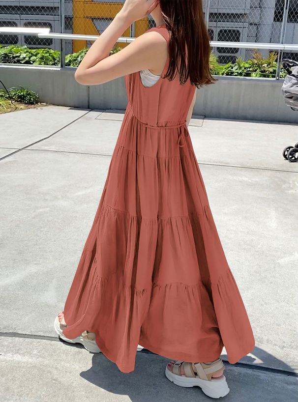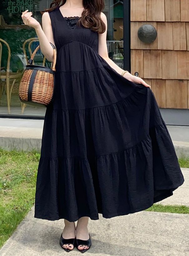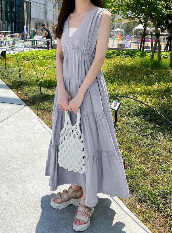 • 品名:V領蛋糕層次飄逸背心洋裝