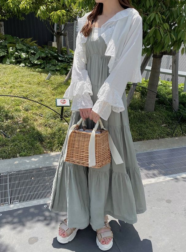 日本 GRL - V領蛋糕層次飄逸背心洋裝-軍綠