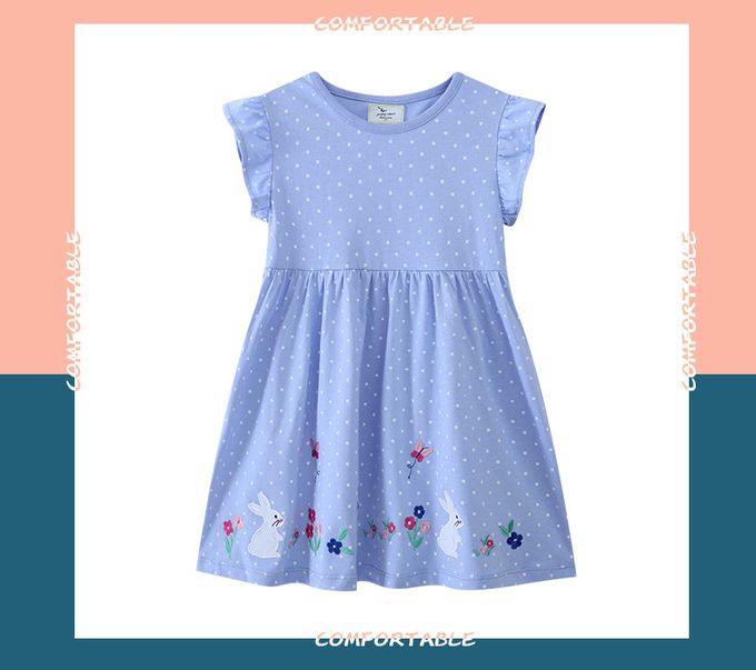 Jumping meters - 棉質圓領小飛袖洋裝-花卉兔子-藍紫點點