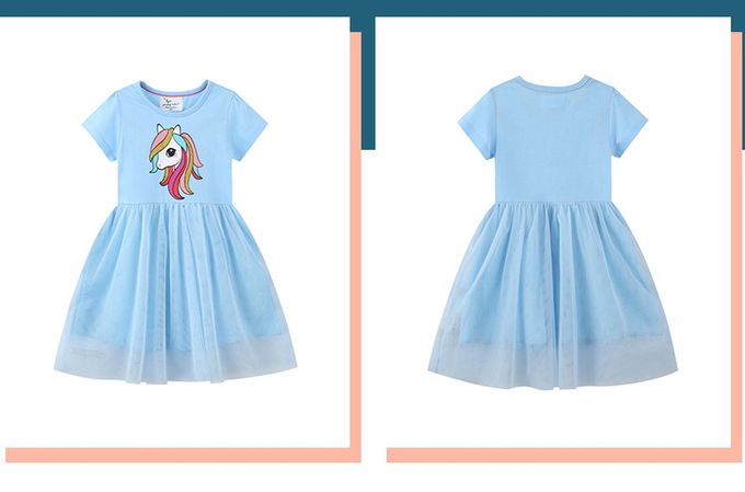 棉質圓領短袖網紗洋裝-繽粉獨角獸-藍色