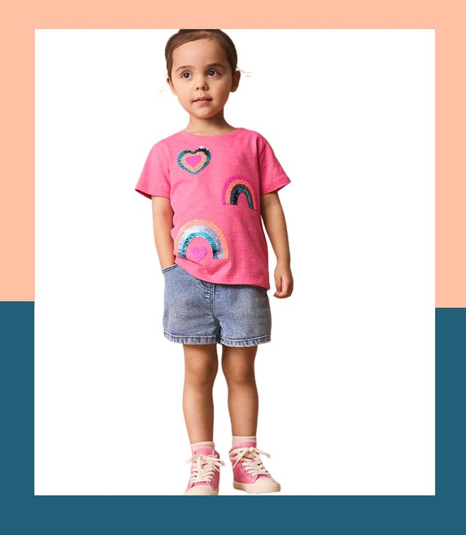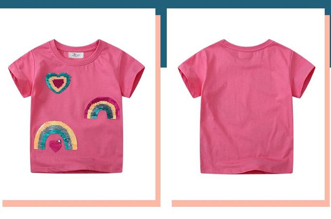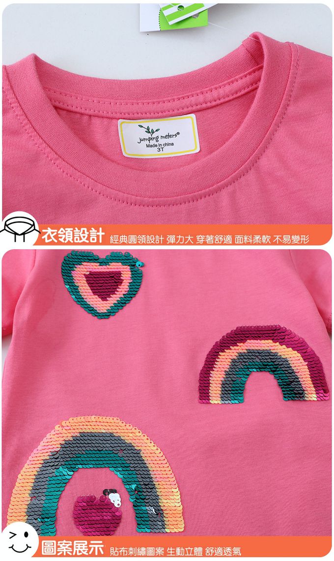 棉質圓領短袖上衣-亮片彩虹-桃粉