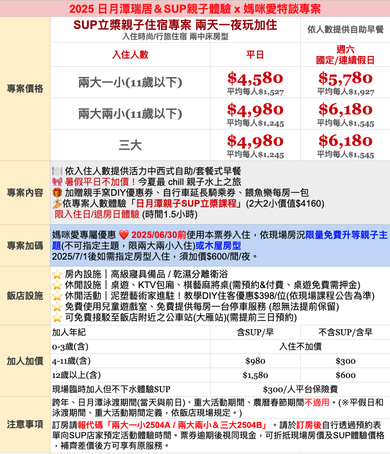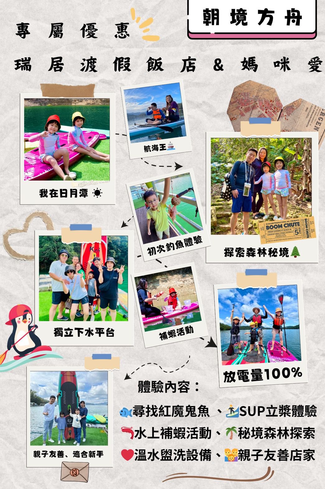 註:依專案人數體驗「日月潭親子SUP立槳課程」(1.5小時) 含森林步道探險、SUP自由體驗、教練隨團側拍及戒護、水上補魚蝦體驗、水中生態解說、簡易溫水盥洗。SUP立槳限入住日與退房日兌換體驗,現場臨時加人但不下水體驗SUP,需加每人$300平台保險費用。預約體驗表單(點我前往)