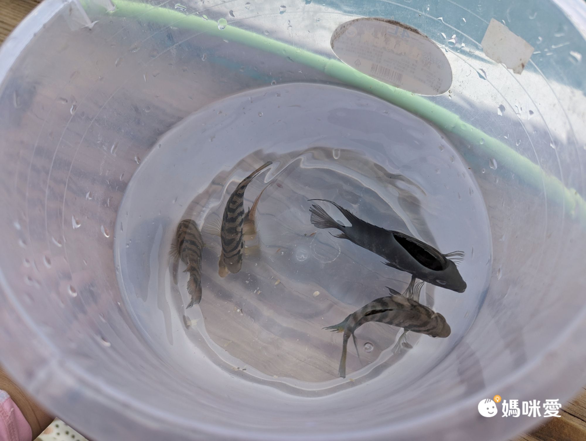 然後,教練又帶我們去收集他前一日預先置放的蝦籠,在裡面發現好幾隻魚,讓叮噹非常驚喜(我們最後有把小魚放回潭裡)