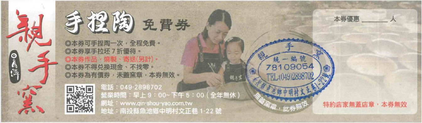 註:親手窯DIY券一張至多六人做使用,自行車延長券一張可多人使用,餵魚樂為每人一包(實際內容請依飯店現場提供為主)