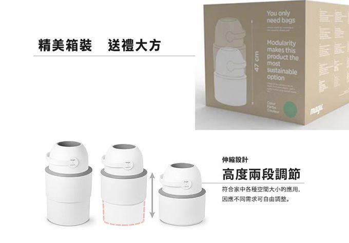 注意事項:【商品規格】 主要材質:塑膠(LDPE、PP) 容量:15L 淨重:約 1.8kg 尺寸:約 54x29x29cm 產地:中國 【注意事項】 ● 請在成人監護下使用。 ● 請定期丢棄桶內污染物並清洗尿布桶。 ● 使用前請務必詳閱說明書,按其指示正確使用。 ● 產品如出現損傷、品質劣化、變形的情況請停止使用。 ● 遠離火源,勿存放於潮濕、陽光直射處,請保持乾燥。 ● 請將本產品的外盒、袋子,收納在孩童無法觸及的地方。 ● 本產品不是玩具,因旋轉部位可能有夾傷手指之危險,請勿讓孩童使用。 ● 為避免嬰兒或兒童產生窒息之危險,請於拆卸後立即將塑膠袋銷毀或遠離嬰兒及兒童。 ● 請用含水的柔軟海綿沾取中性清潔劑清洗,勿使用揮發油等有機溶劑、含研磨劑、含氯...等清潔劑清洗擦拭。 ● 可與一般的塑膠袋一起使用。 ● 最多容納約30片尿布(依據尿布大小,數量可能略有不同)。