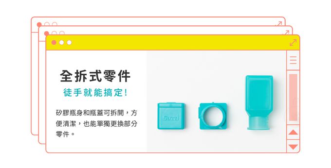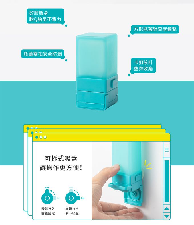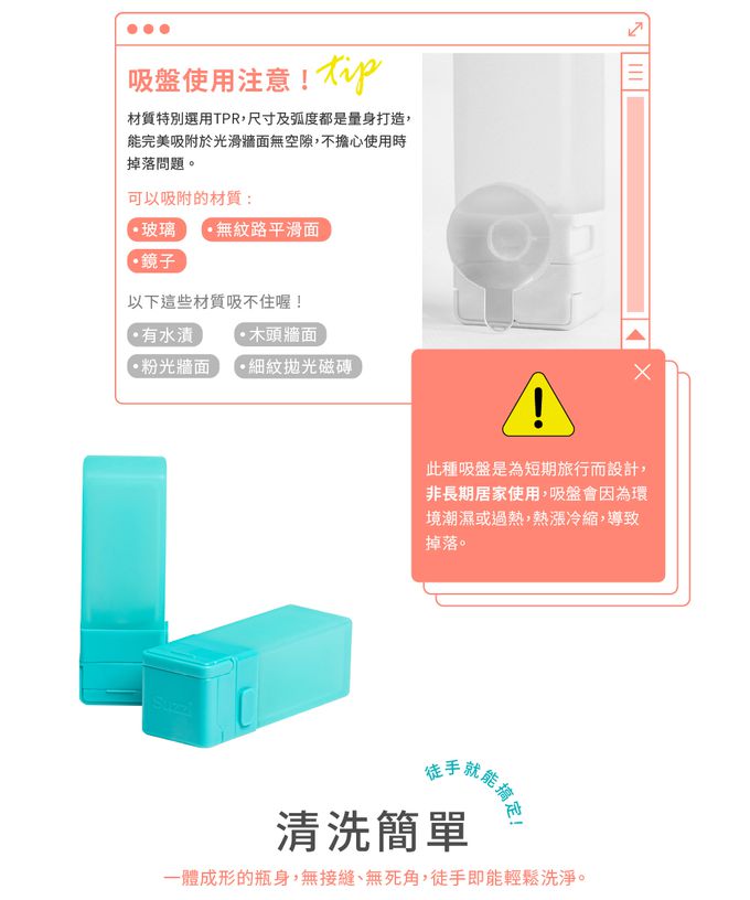 注意事項:1. 請勿放在小孩附近,避免誤食。 2. 第一次使用請先清洗乾淨。 3. 吸盤為輔助設計,可視需求使用。 4. 使用後請清洗乾淨,避免染色。 5. 遠離尖銳物以免破壞瓶身。 6. 請勿裝填食用油、按摩油、卸妝油。