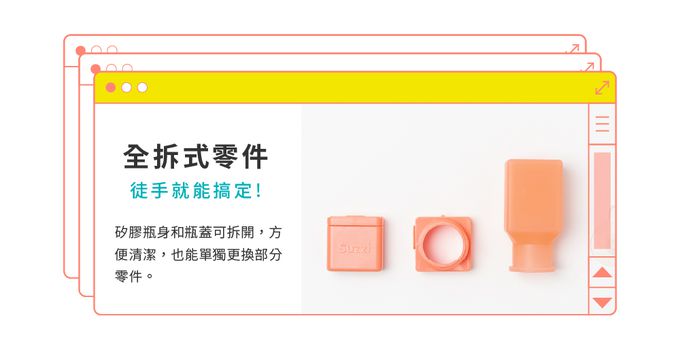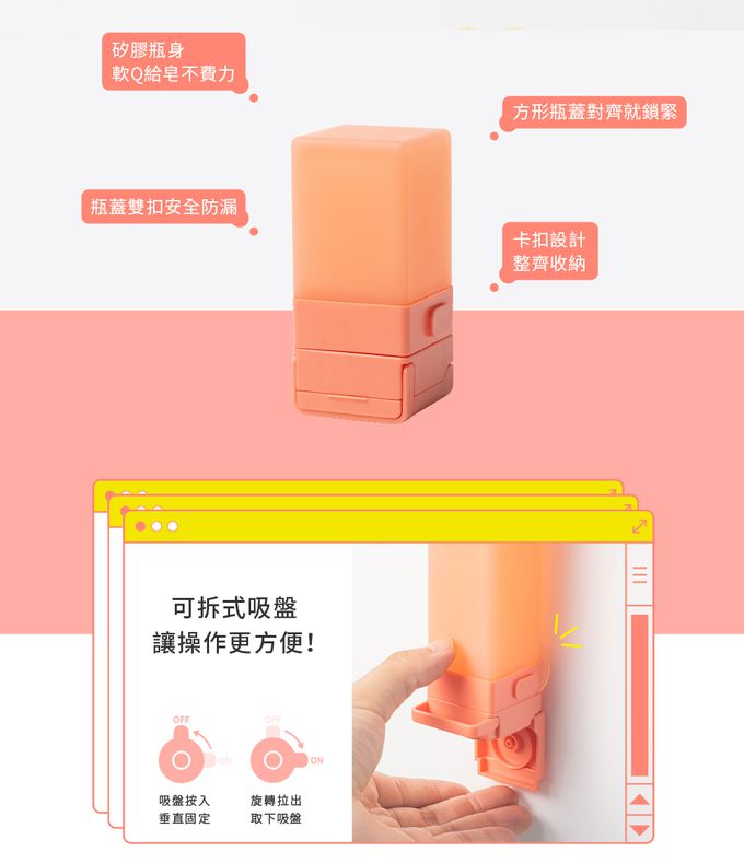 注意事項:1. 請勿放在小孩附近,避免誤食。 2. 第一次使用請先清洗乾淨。 3. 吸盤為輔助設計,可視需求使用。 4. 使用後請清洗乾淨,避免染色。 5. 遠離尖銳物以免破壞瓶身。 6. 請勿裝填食用油、按摩油、卸妝油。