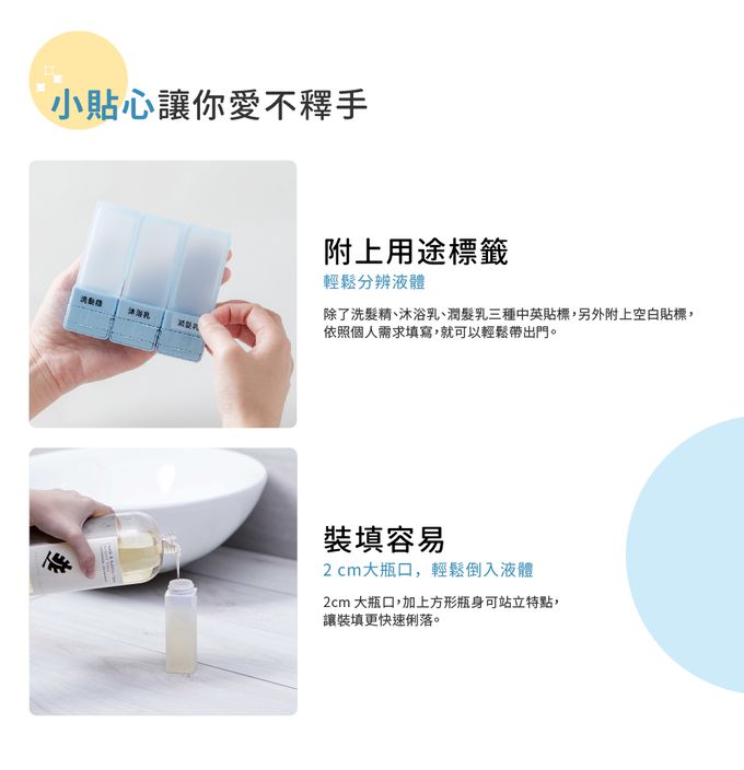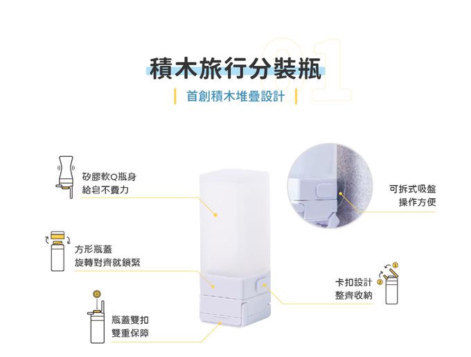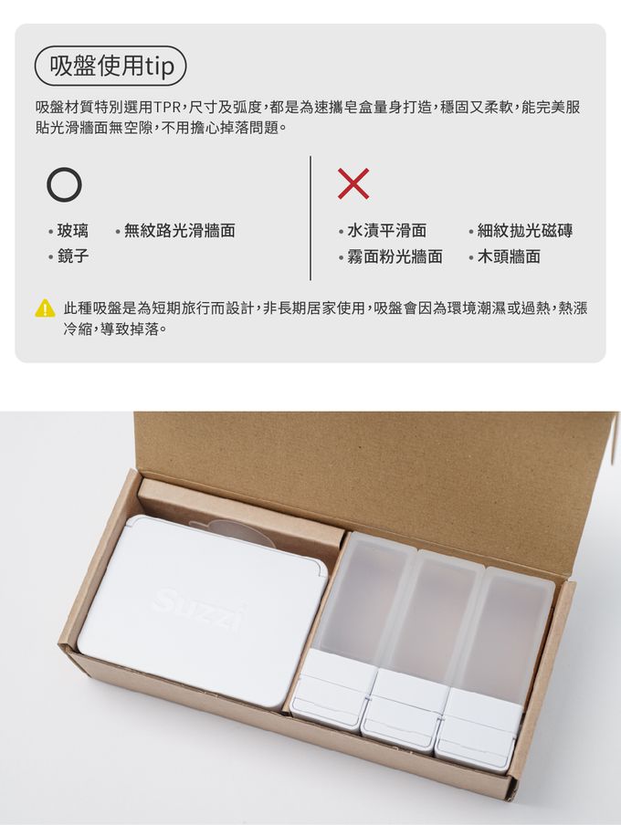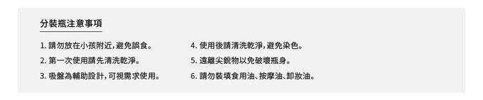 注意事項:1. 請勿放在小孩附近,避免誤食。 2. 第一次使用請先清洗乾淨。 3. 吸盤為輔助設計,可視需求使用。 4. 使用後請清洗乾淨,避免染色。 5. 遠離尖銳物以免破壞瓶身。 6. 請勿裝填食用油、按摩油、卸妝油。