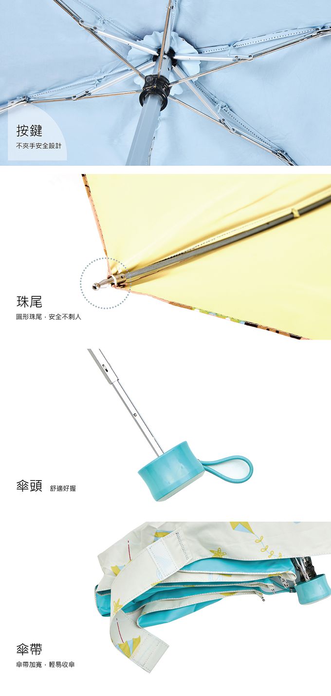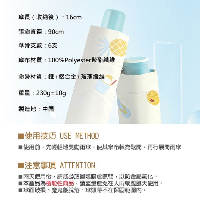 注意事項:1.雨天使用後,請務必放置於陰暗處晾乾,以防金屬氧化。 2.本產品為機能性商品,請盡量避免在大雨或颱風天使用。