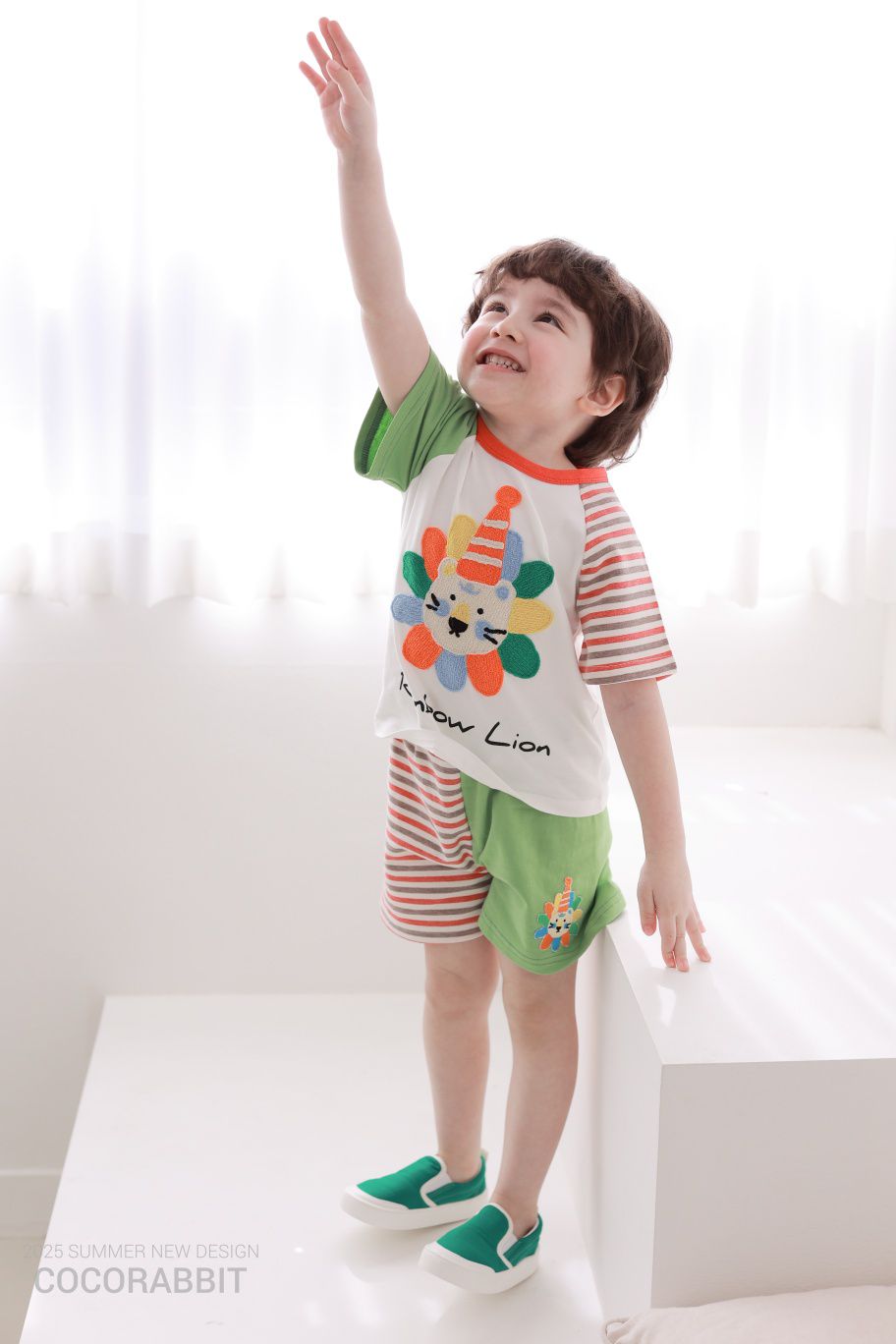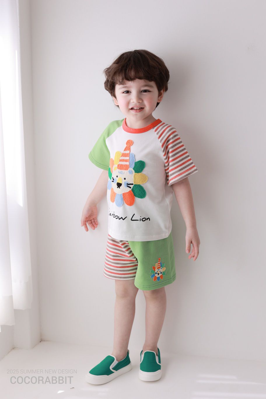 韓國 Coco Rabbit - 彩虹獅撞色條紋短袖上衣-綠X紅