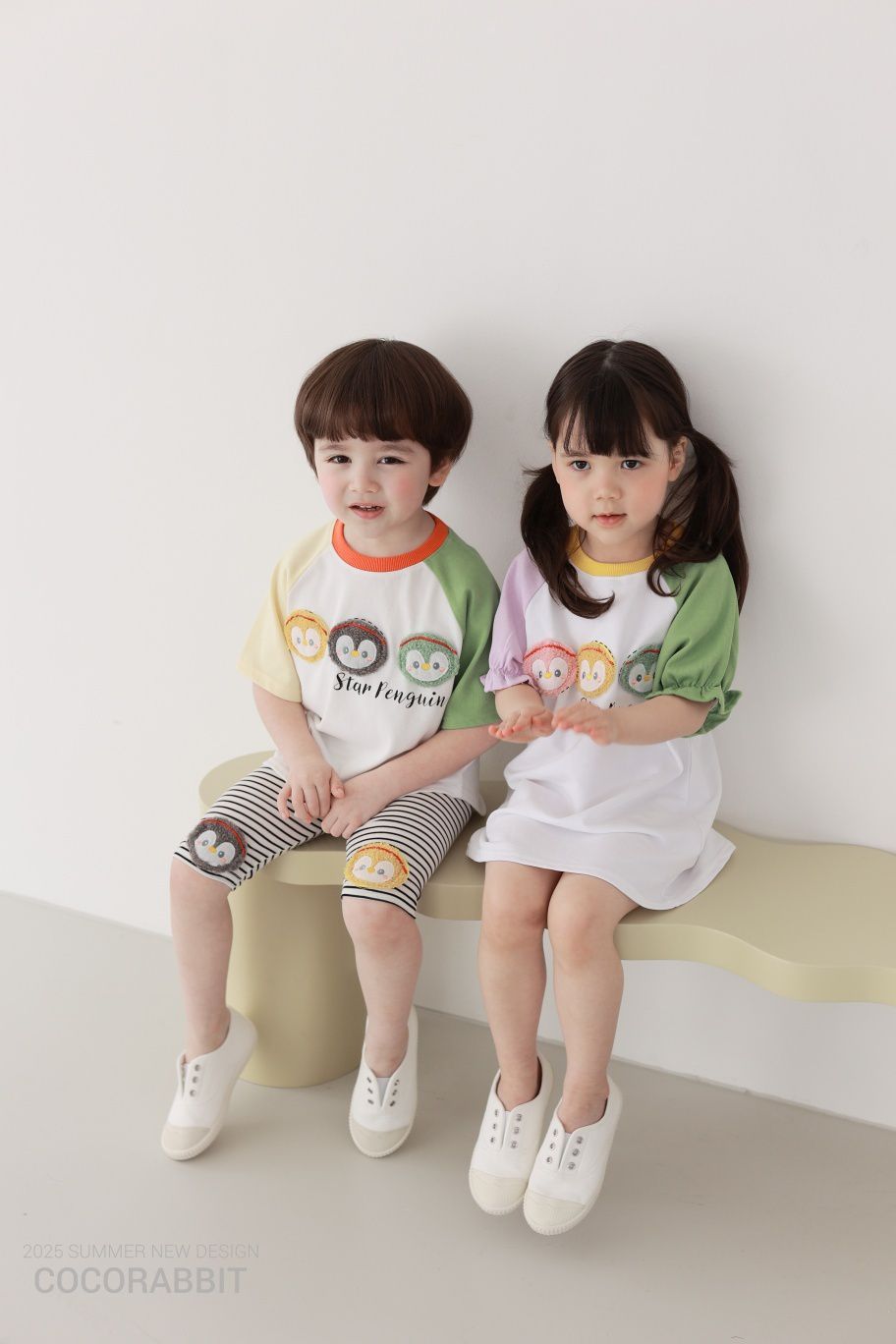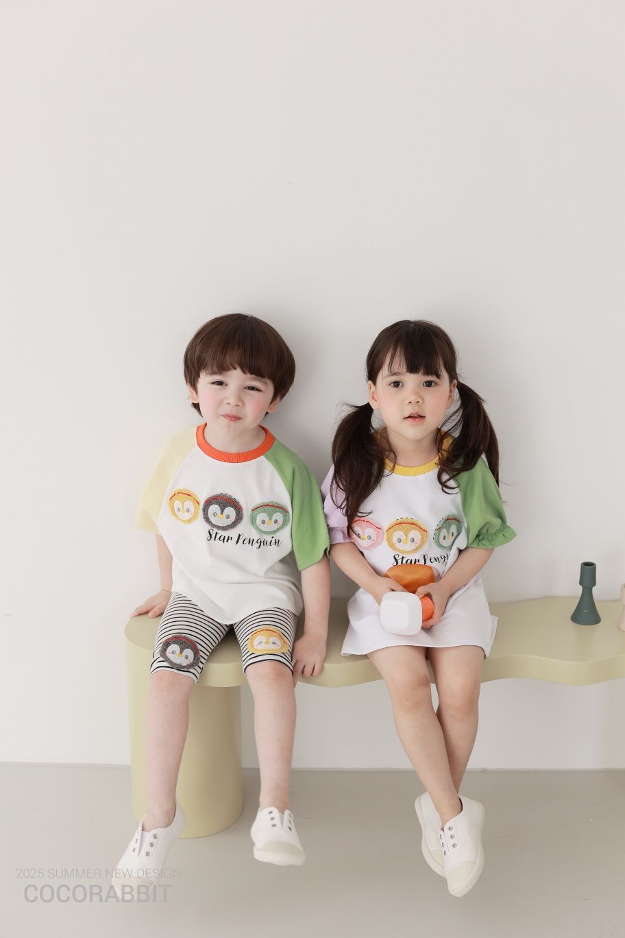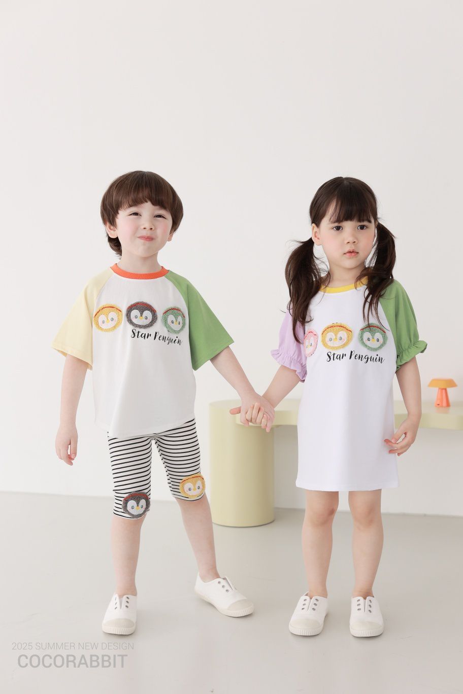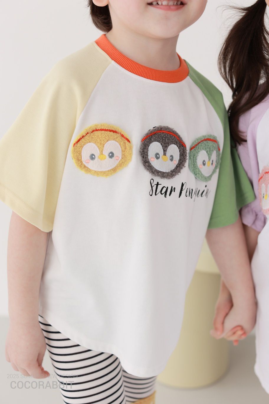 韓國 Coco Rabbit - 萌萌毛絨企鵝撞色短袖上衣-淡黃X豆綠