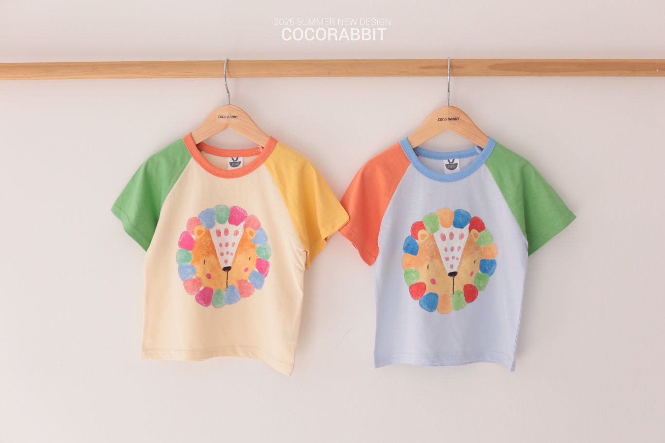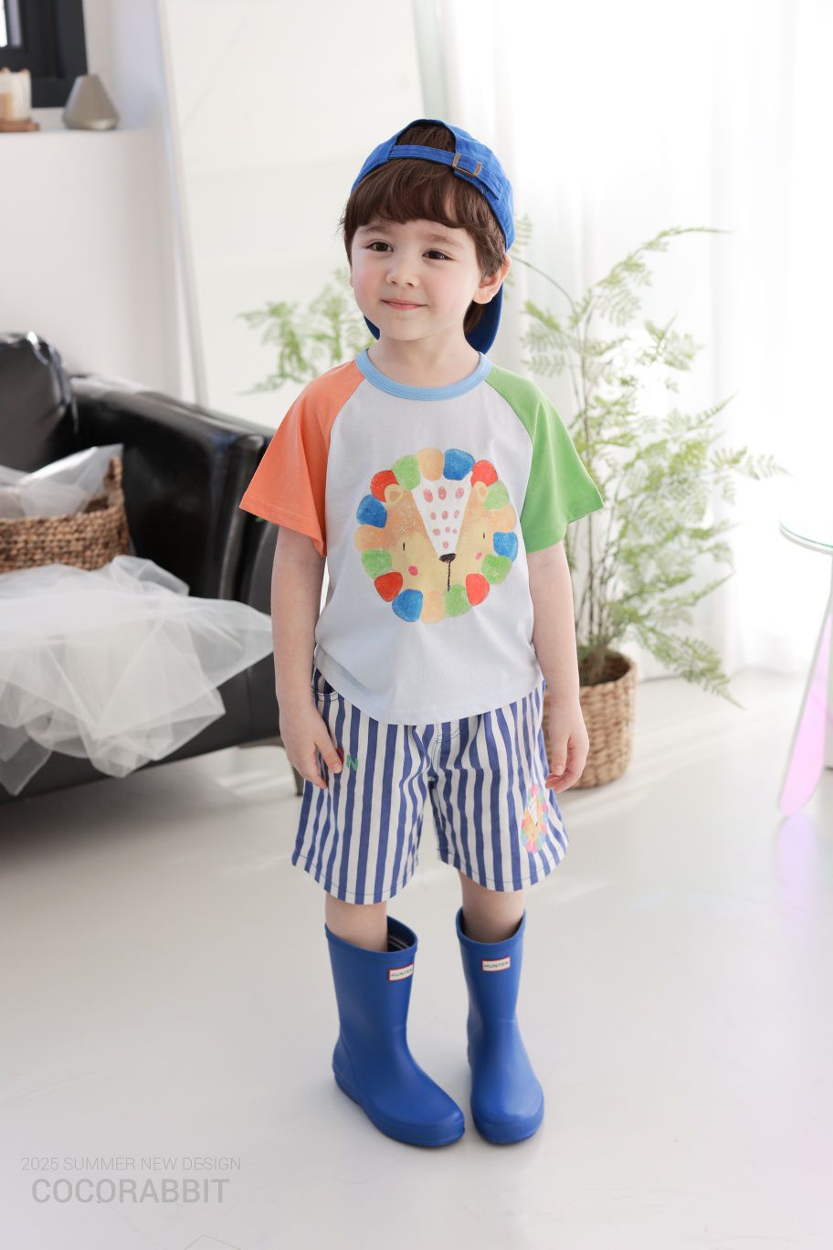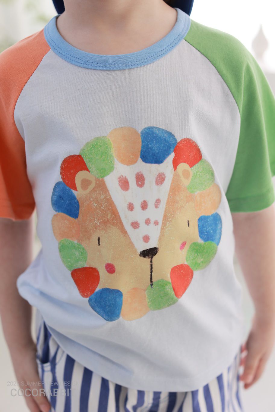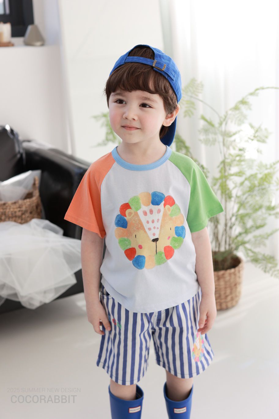 韓國 Coco Rabbit - 繽紛水彩獅子撞色短袖上衣-橘X綠