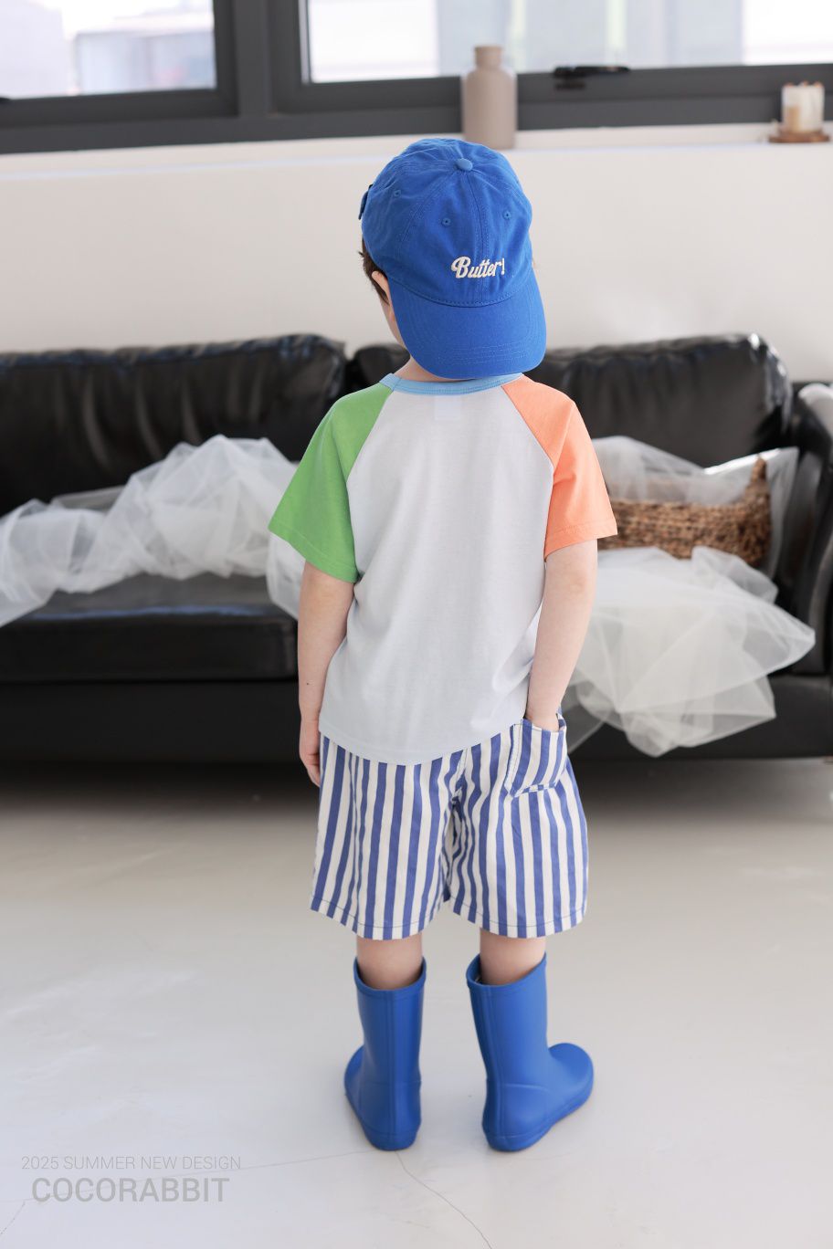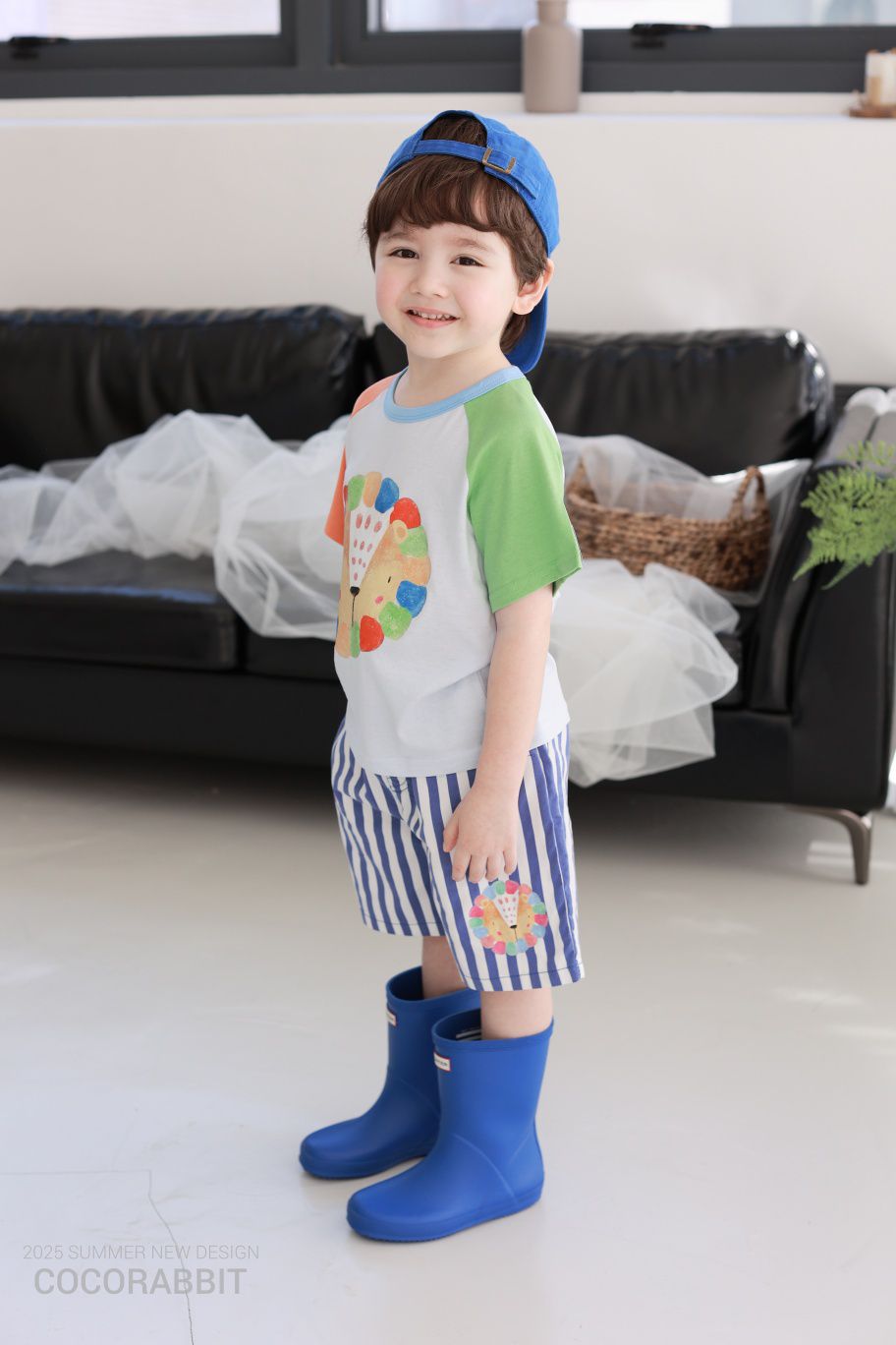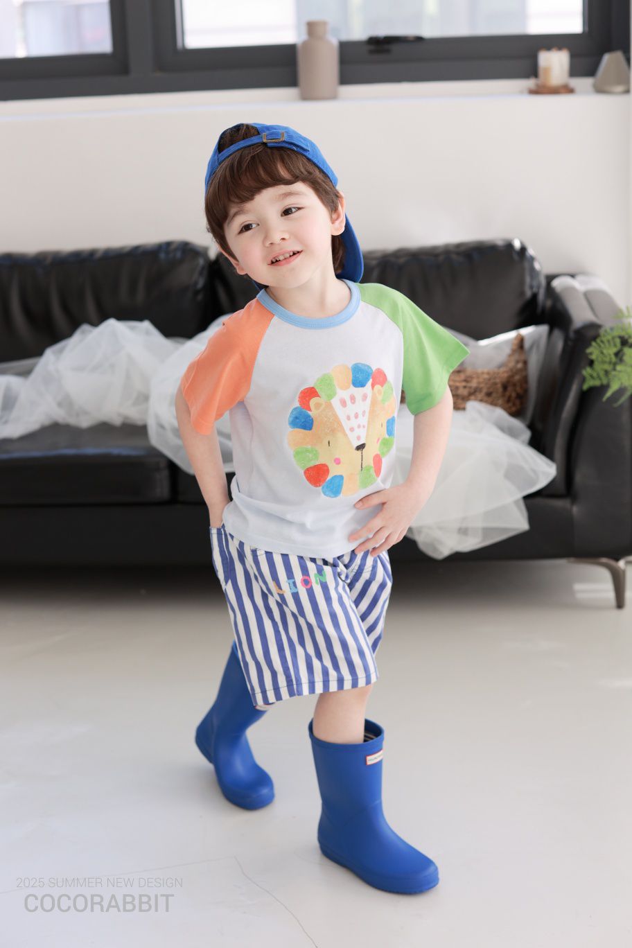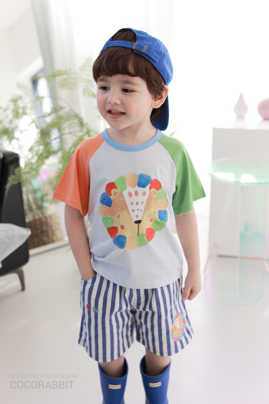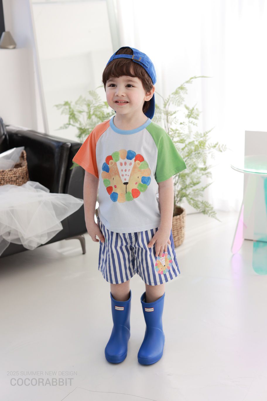 韓國 Coco Rabbit - 繽紛水彩獅子撞色短袖上衣-橘X綠